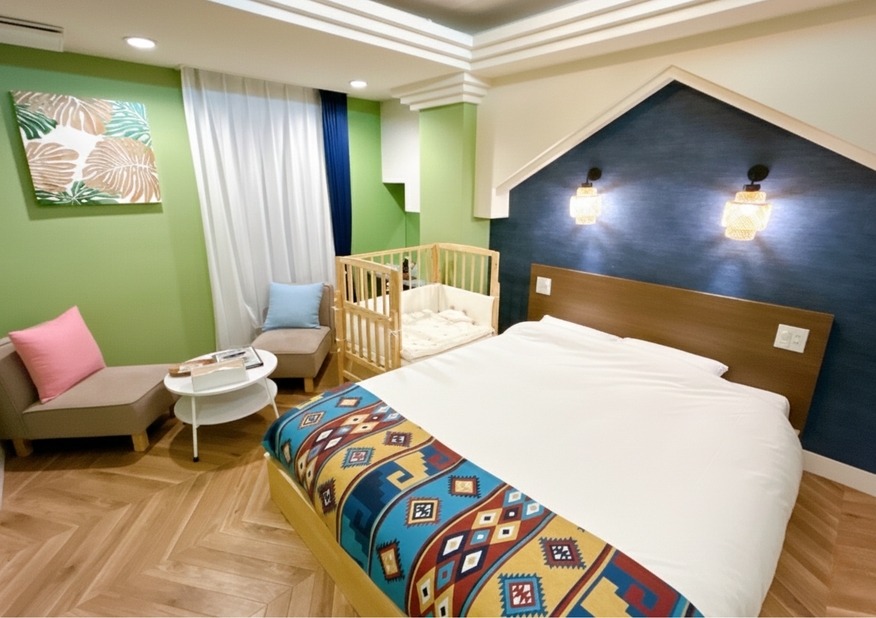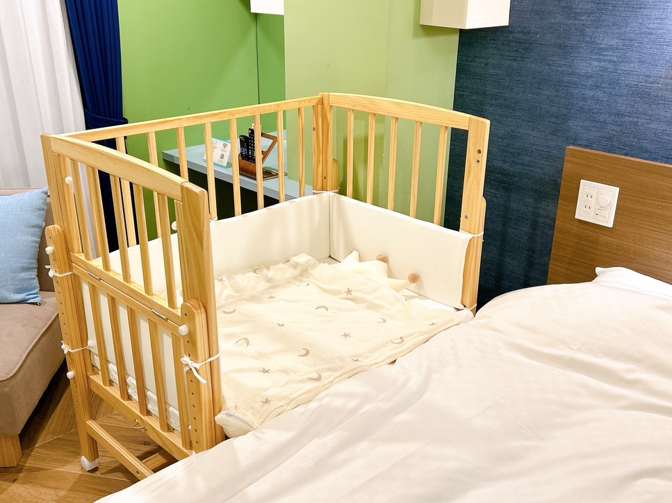 ゆったりサイズのクイーンベッド1台に添い寝が出来るベビーベッド完備。コンパクトなお部屋ですが、ベビーバスが使えるシャワールームもありパパママも安心※寝具追加不可