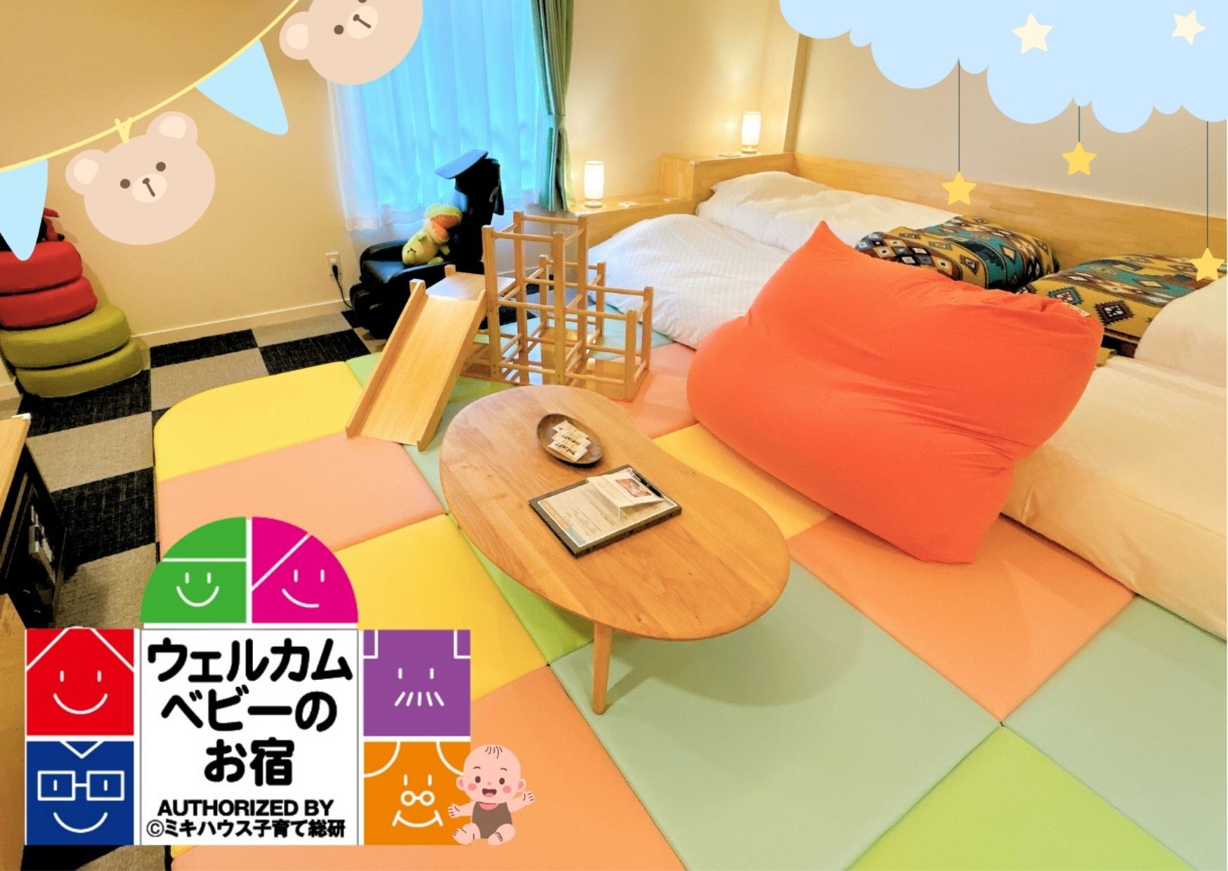 最上階確約。お子様も安心のウレタンマットのお部屋。 すべり台や、木育あそびができるおもちゃがあり、パパ・ママにはマッサージ器もご用意♪