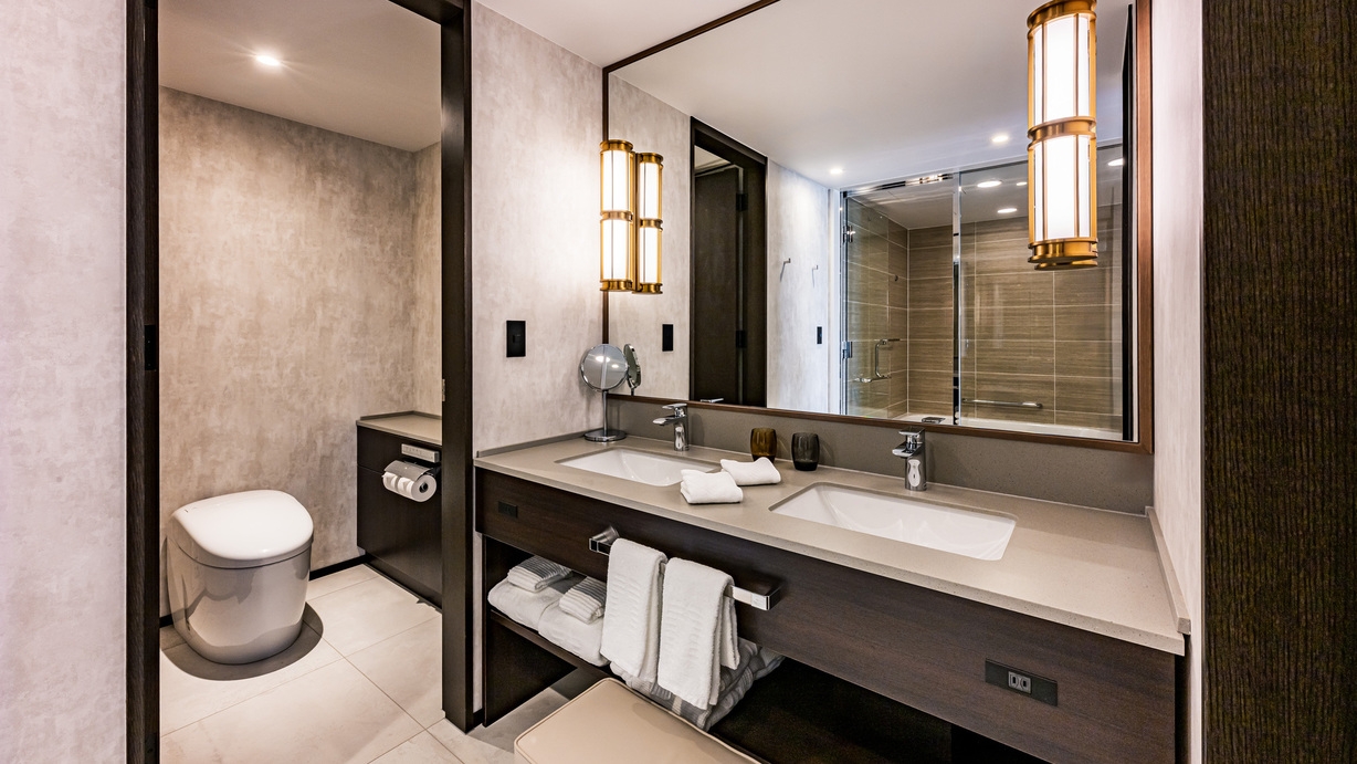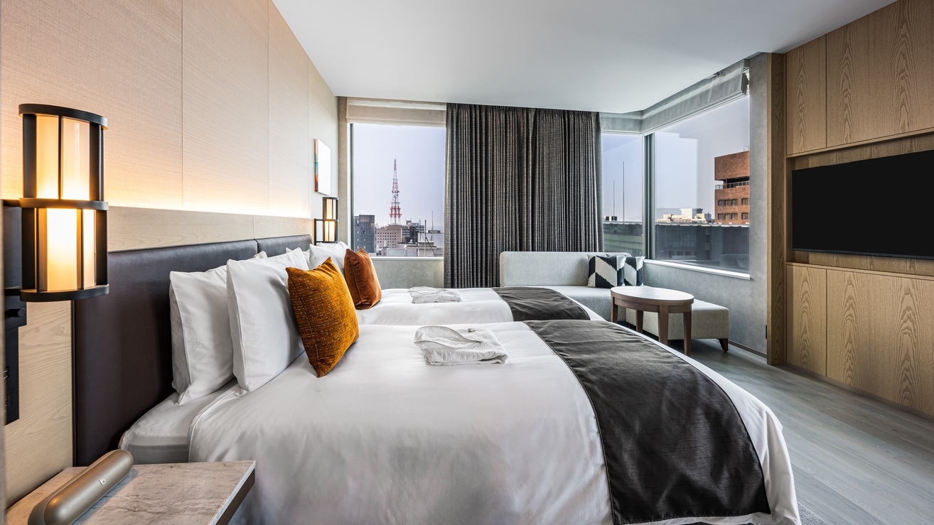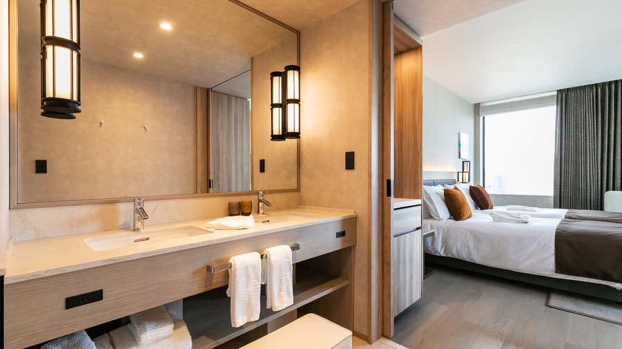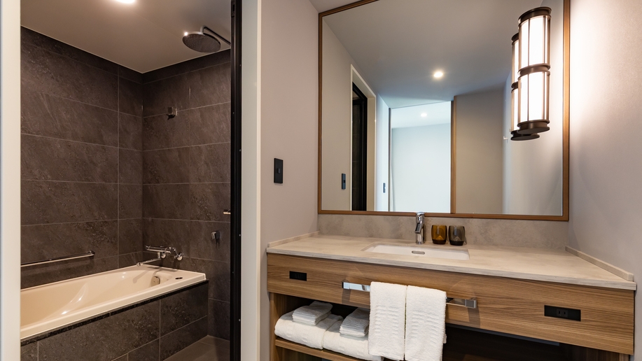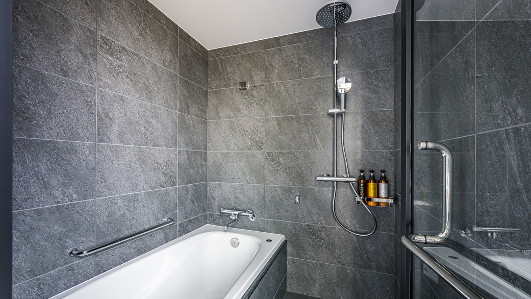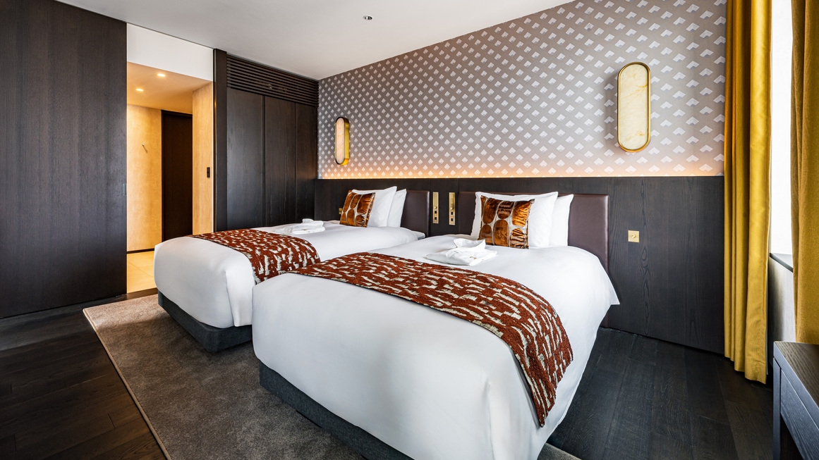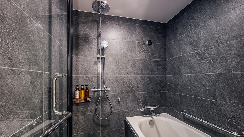 ベッドサイズW100cm×L203cm 2台+エキストラベッド1台(シモンズ社製)/洗い場付バスルーム(レインダンスシャワー完備/ハンスグローエ社製)