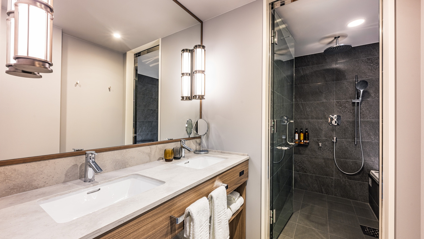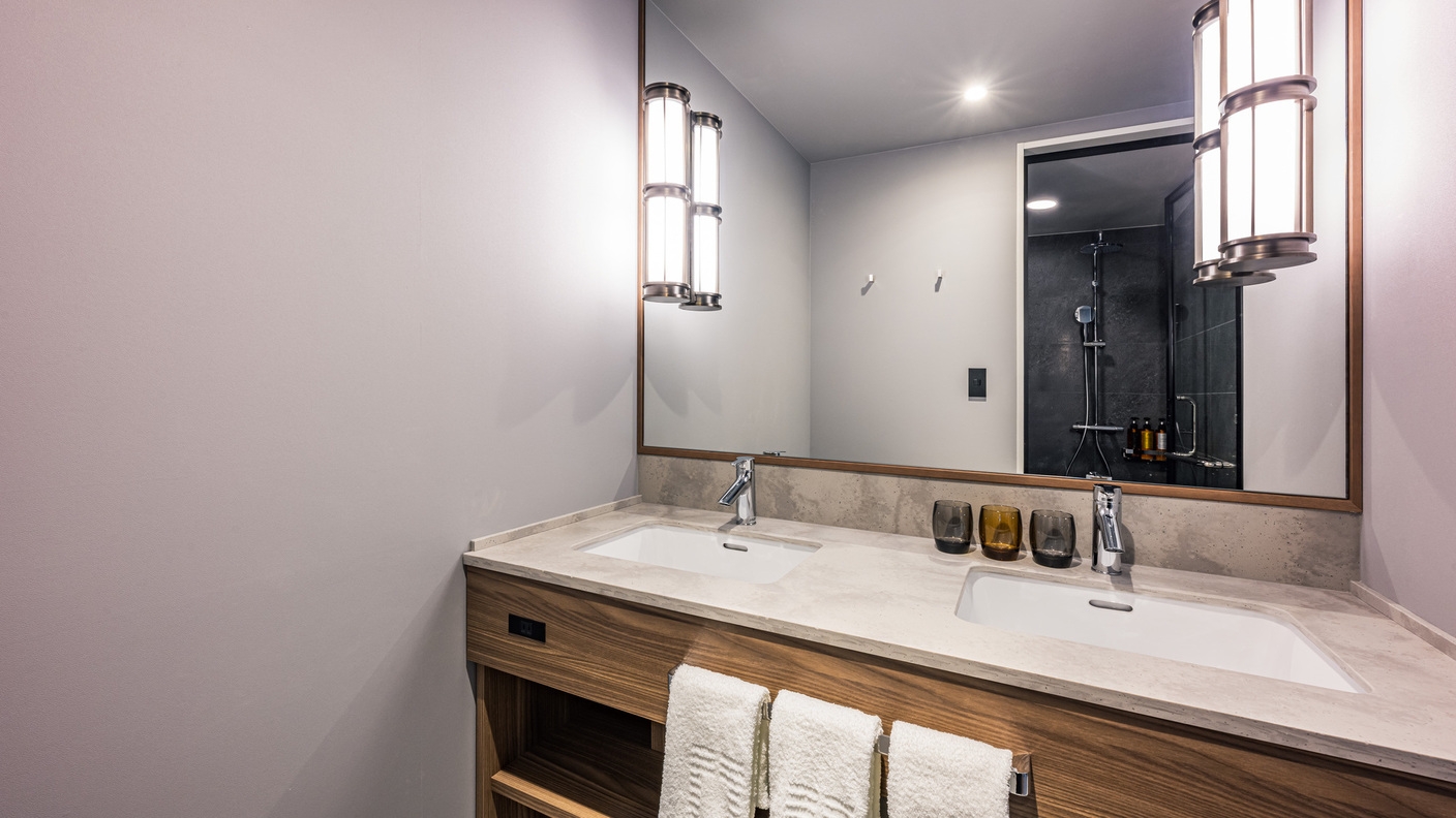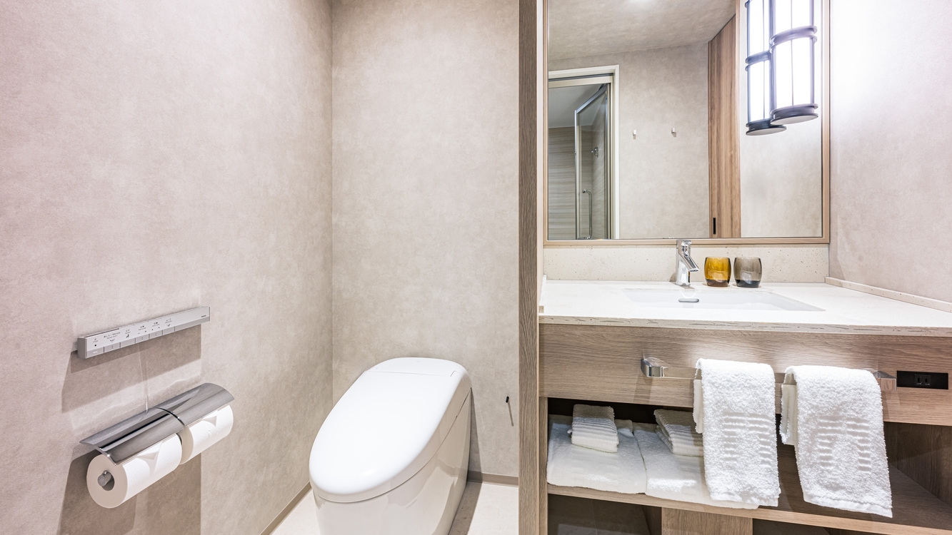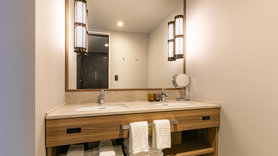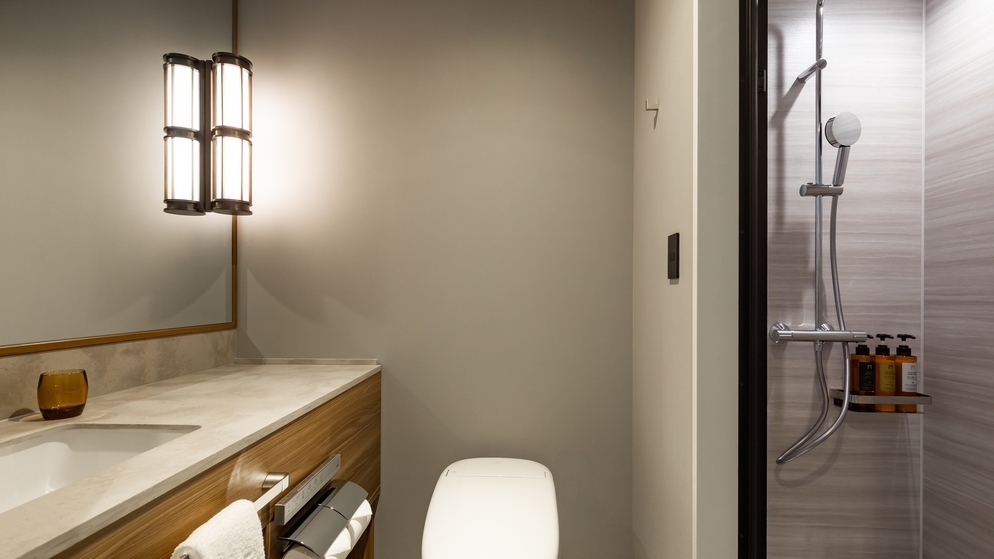 ベッドサイズW100cm×L203cm 2台+エキストラベッド1台(シモンズ社製)/洗い場付バスルーム(レインダンスシャワー完備/ハンスグローエ社製)