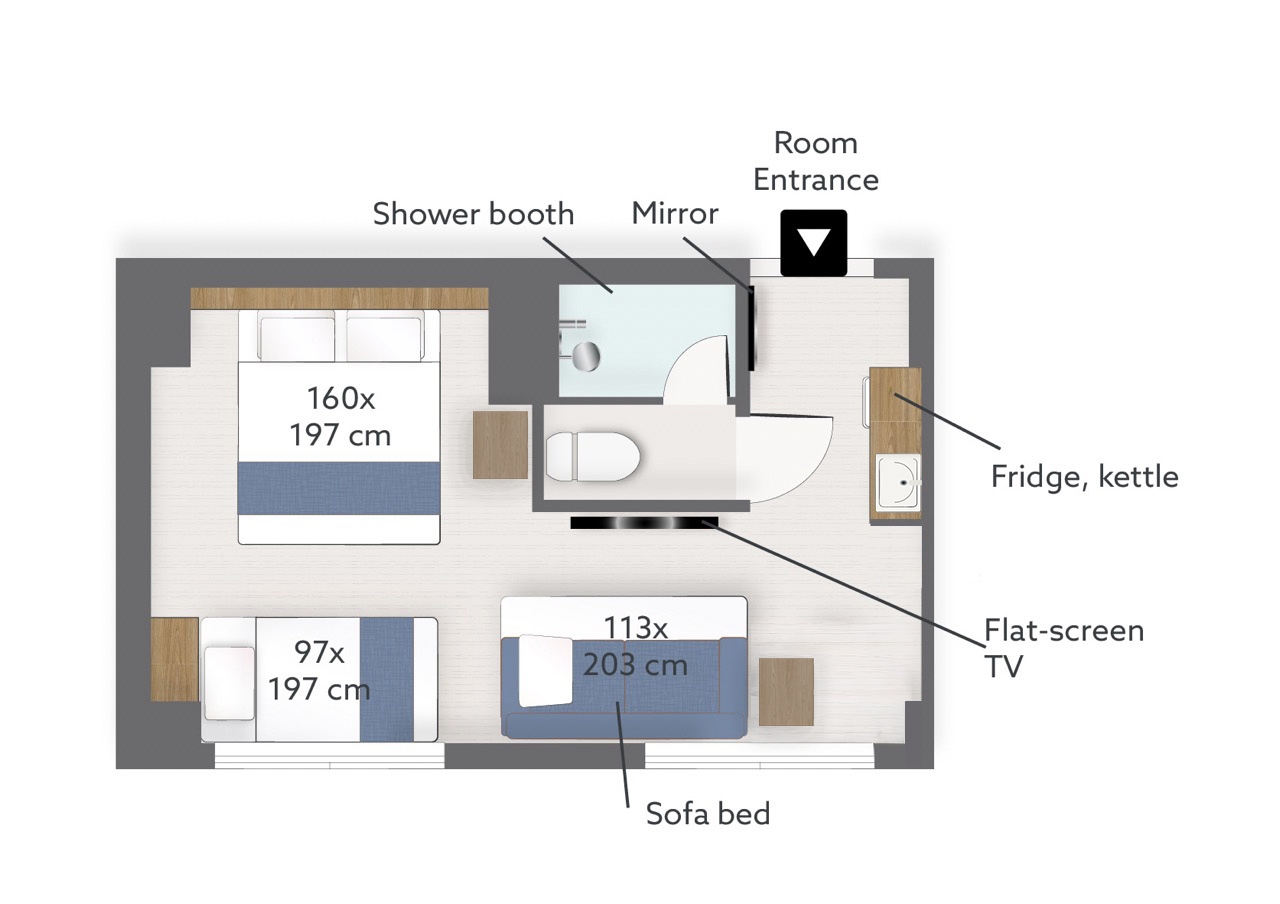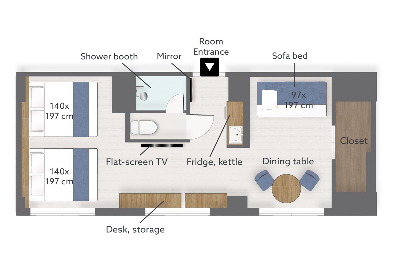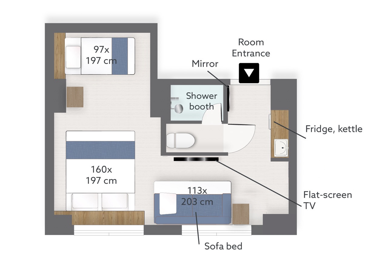 日中の散策や夜の賑わいを楽しむのに最適な拠点。クイーンベッド、ツインベッド、ソファベッドを備え、最大4名まで宿泊可能。