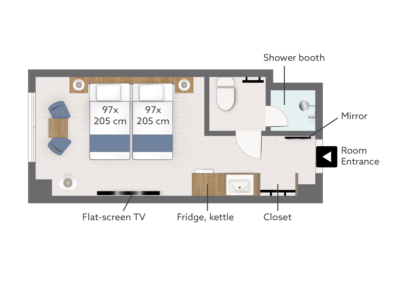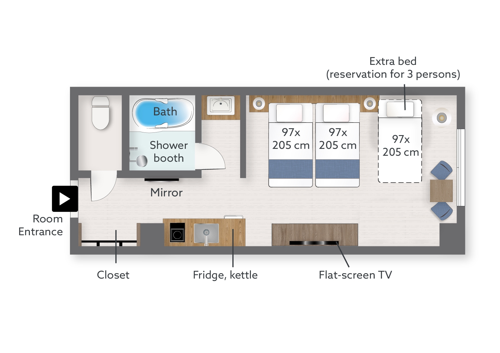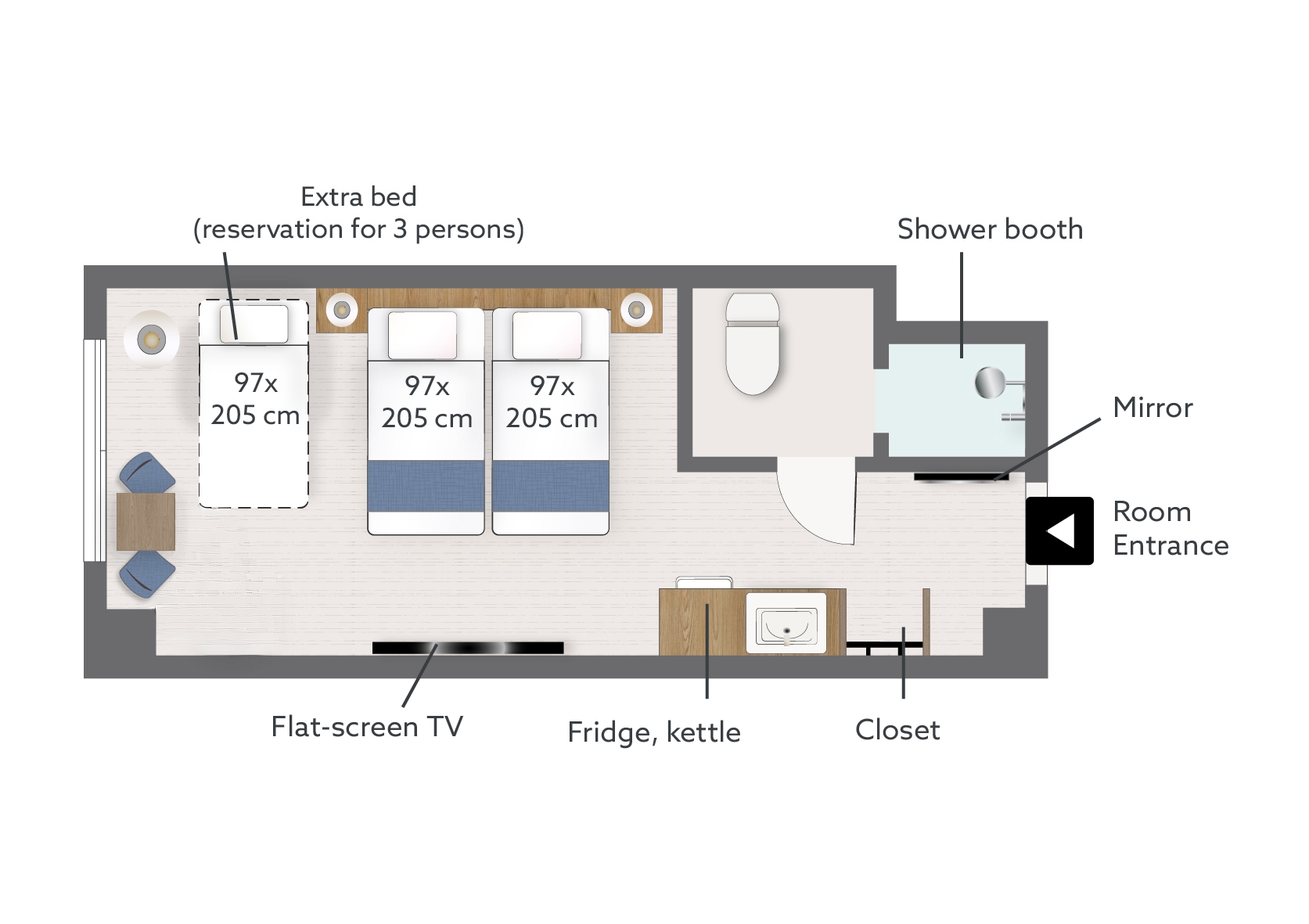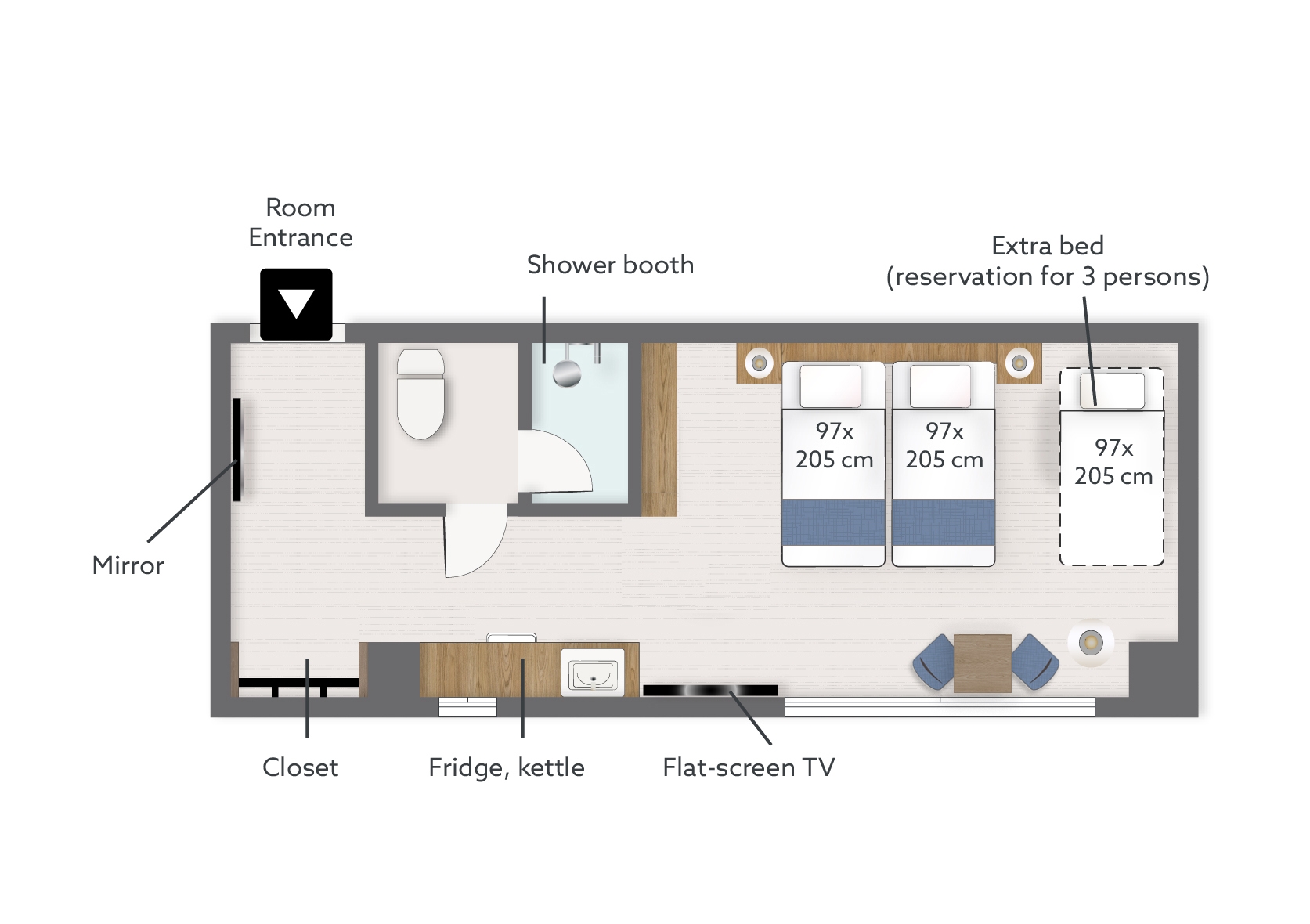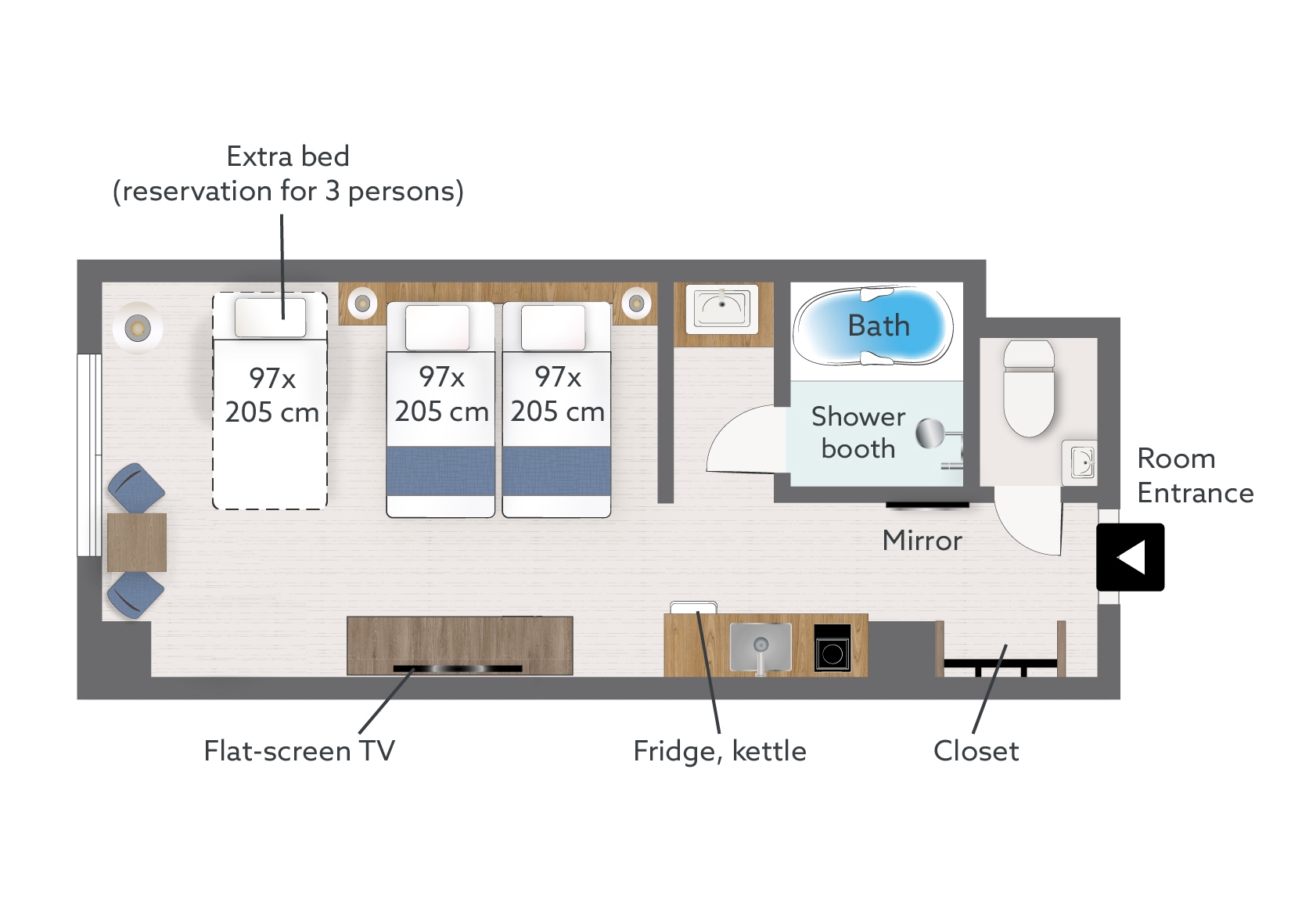 幅広いお部屋にツインベッドが2台と3台目配置可能。あなたのスタイルに合わせてカスタマイズされた特別な空間をご用意。
