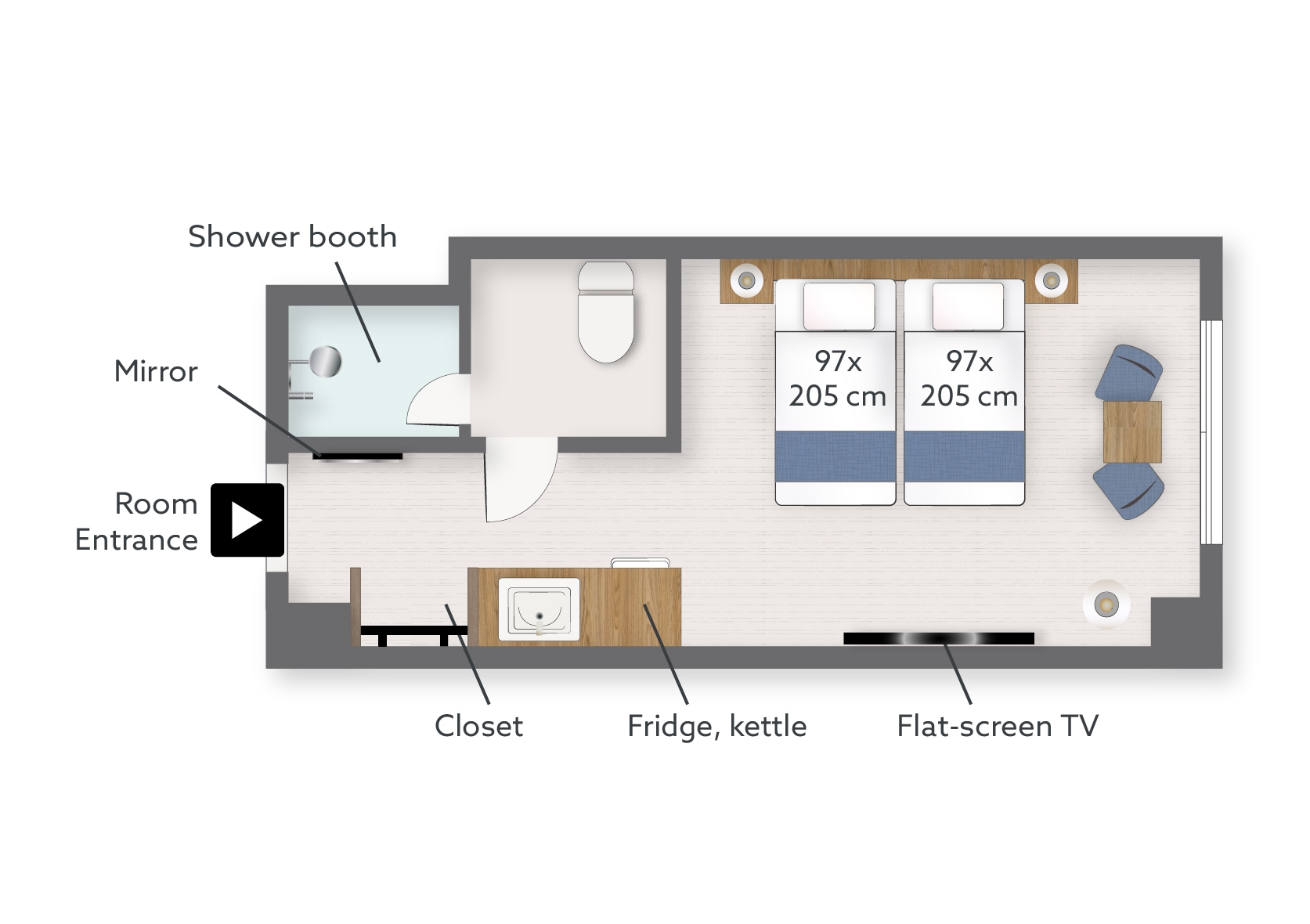 ゆったりとした客室に2名様までご利用可能なワイドサイズのベッドをご用意。自分空間を大切にしたい方にぴったりのお部屋です。