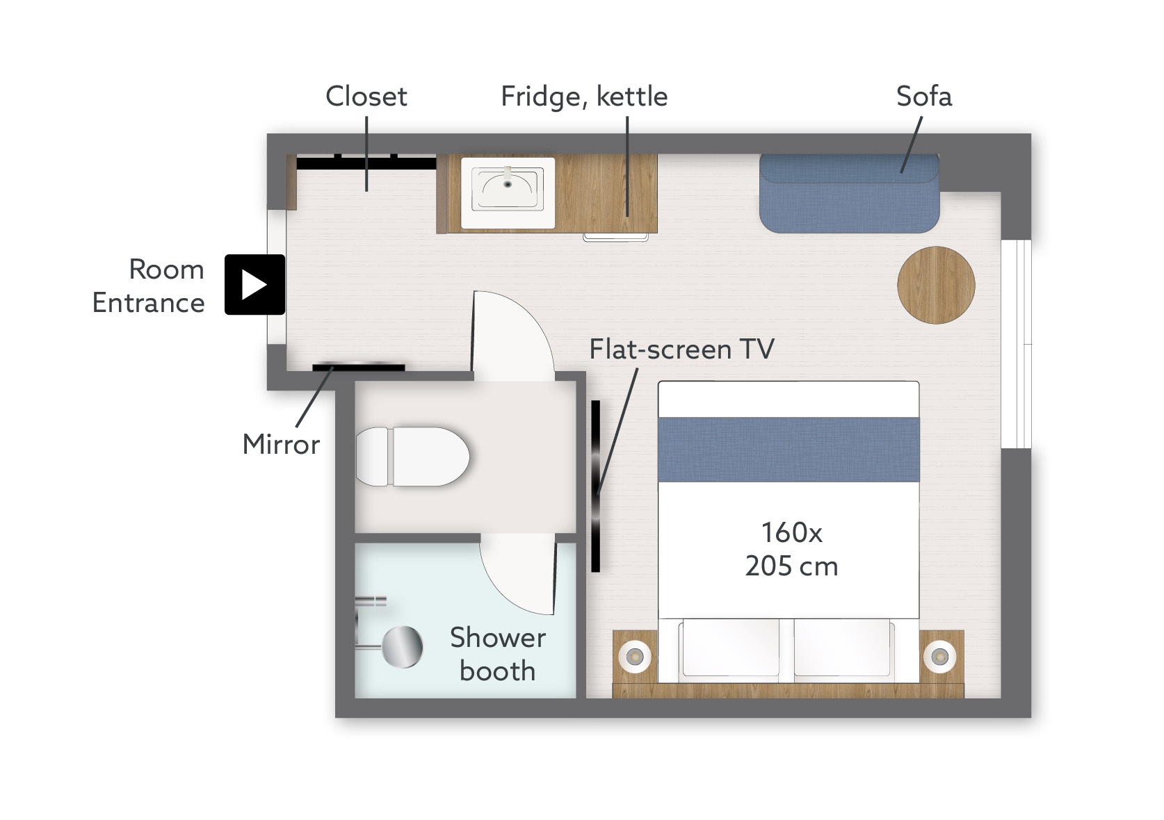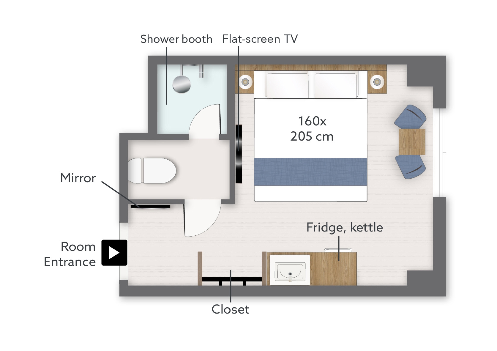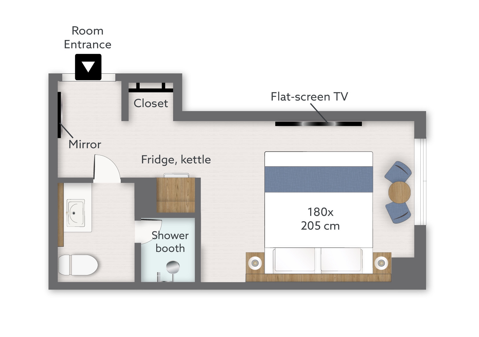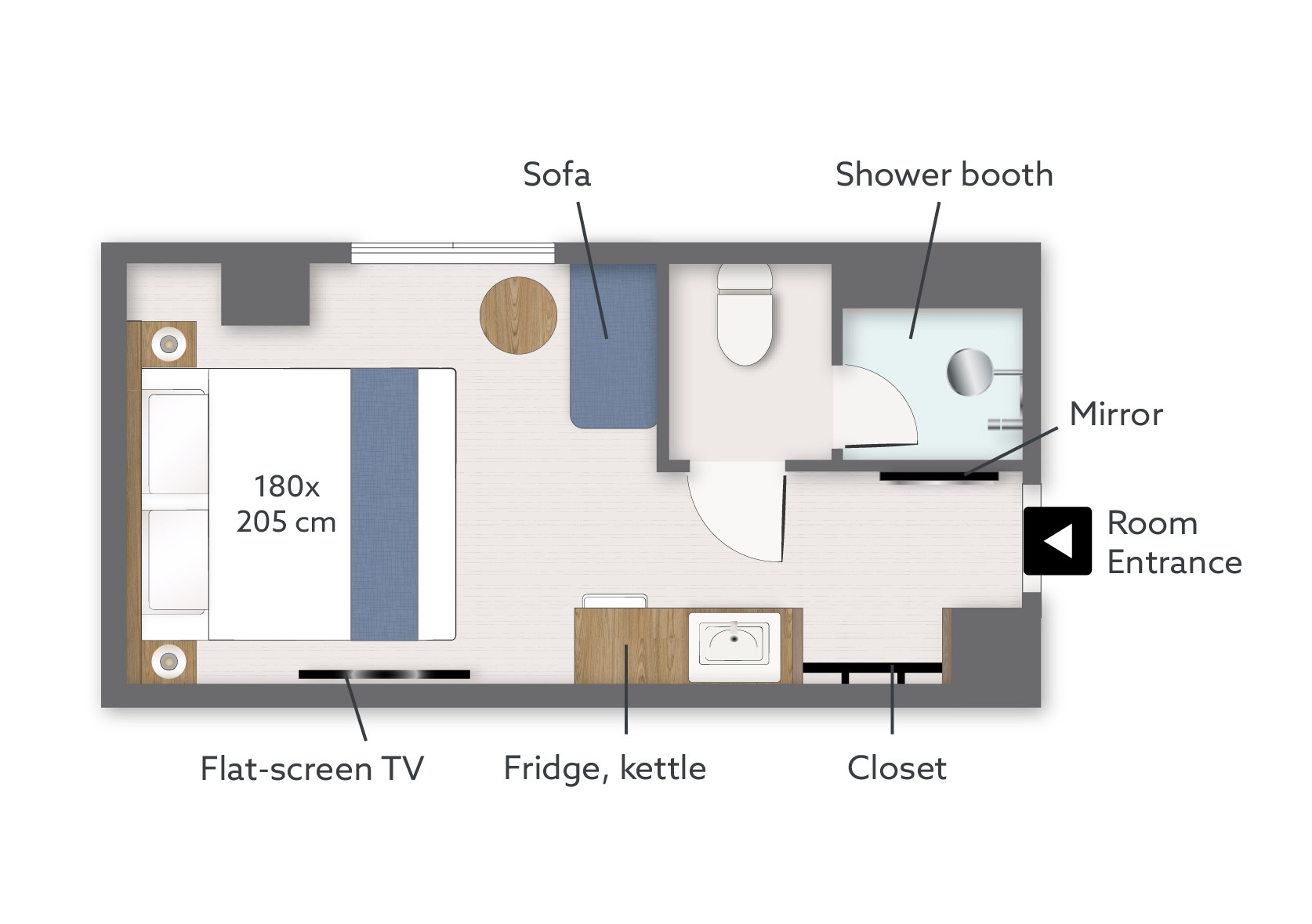 豊富な収納スペースを備えた自然光が差し込む爽やかな客室で、心地よいひとときをお過ごしください。最大2名様まで宿泊可能。