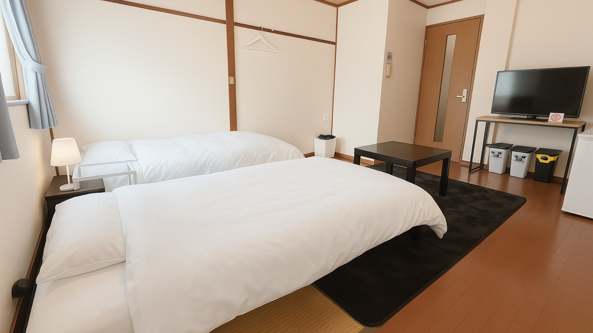 シングルベッド2台を備えた和室6畳のスタンダードツインルームです。禁煙のお部屋で、和の落ち着きと洋の快適さを兼ね備えた空間です。
