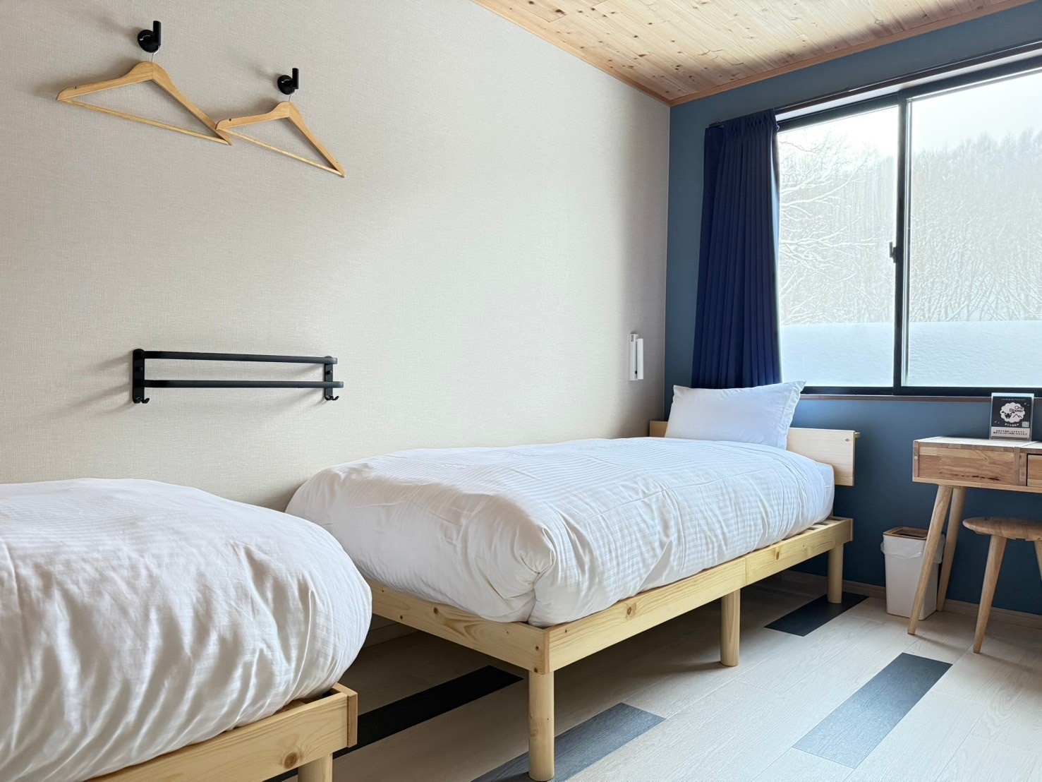 シングルベッド2台を設置。カップルやご夫婦はもちろん、お1人様での利用もOK!シンプルで居心地のよい空間です。床暖房完備で寒い日でも快適にお過ごしいただけます