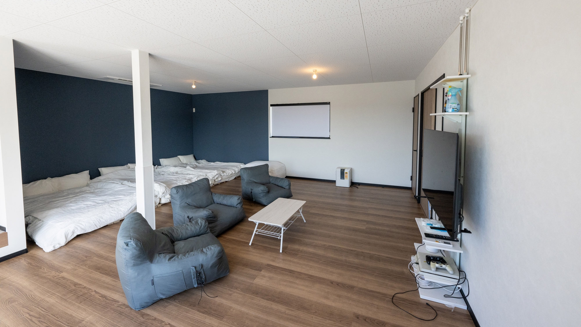 壁掛け式大画面薄型テレビ、ソファーセット、エアコン、