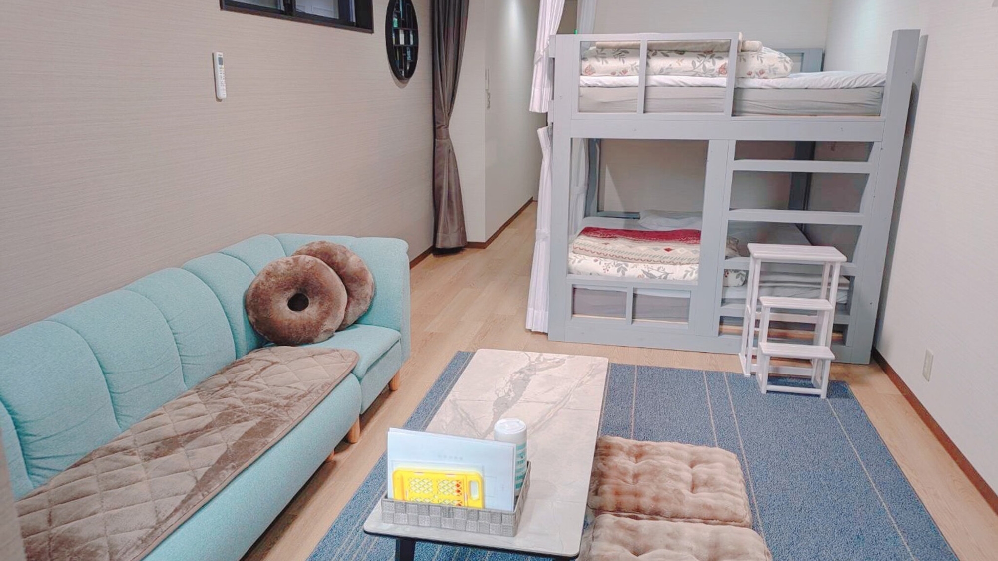 1ルームタイプのお部屋。クイーンサイズの二段ベッド1台を設置しており、最大4名様までお泊りいただけます。独立型のバスルーム・トイレ、簡易キッチン、洗濯機を完備