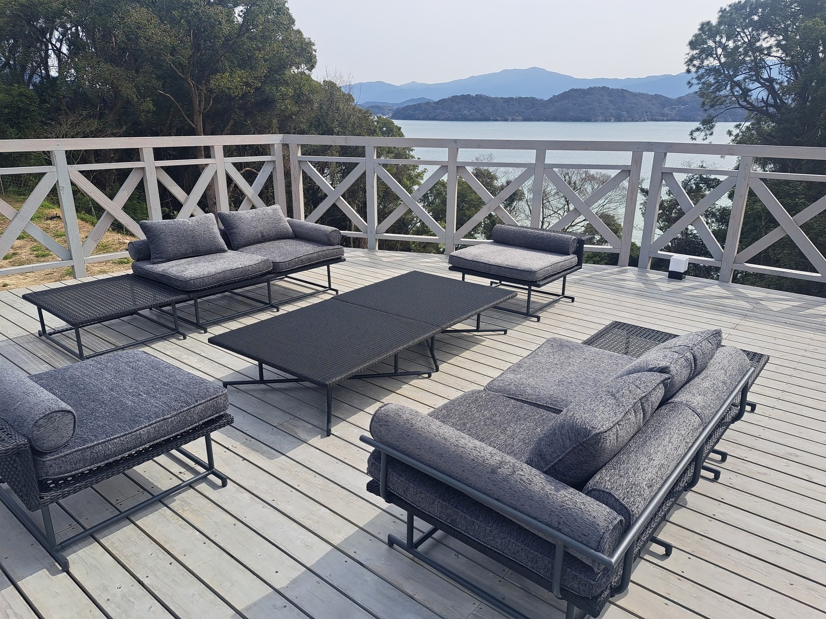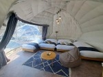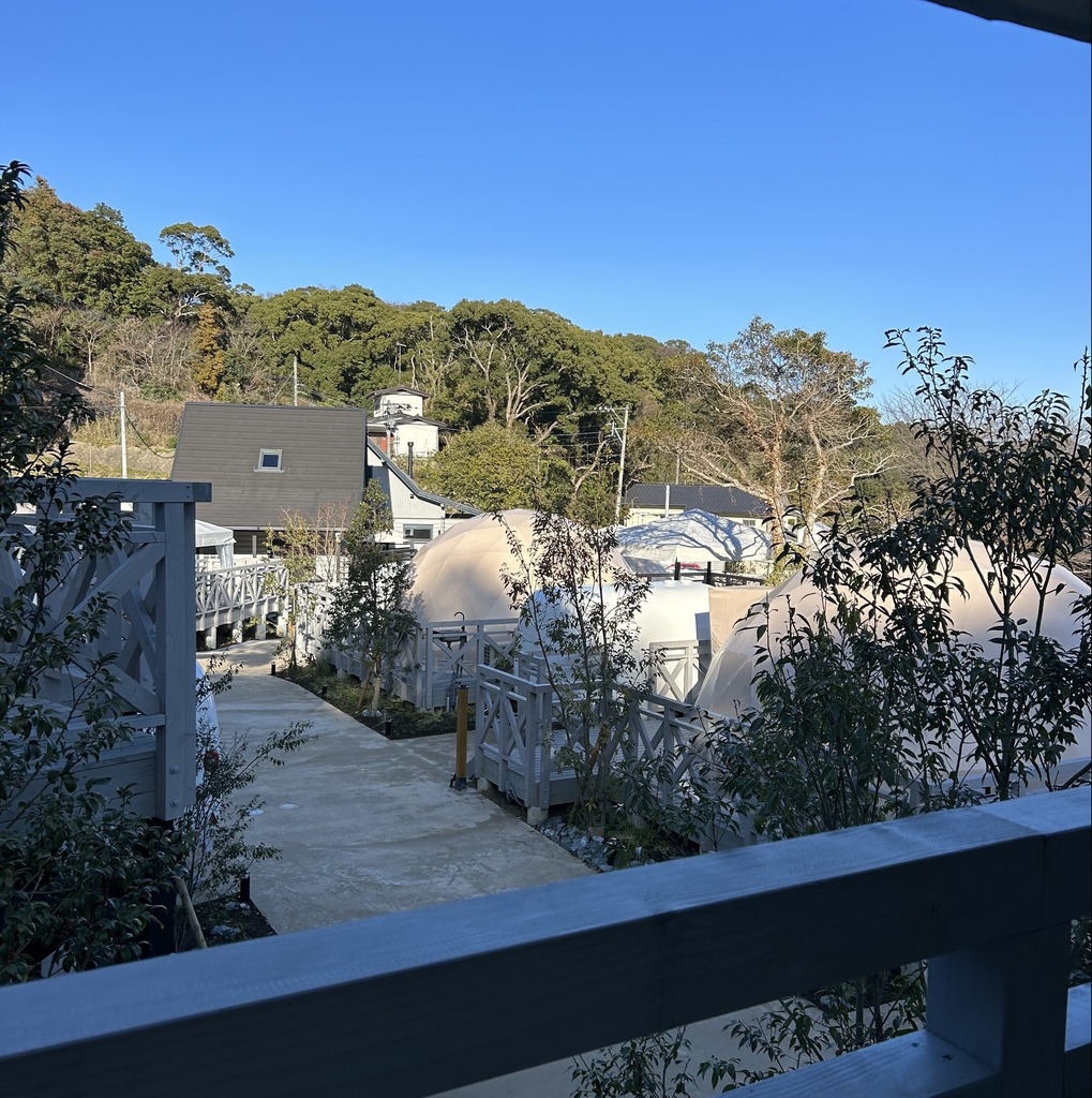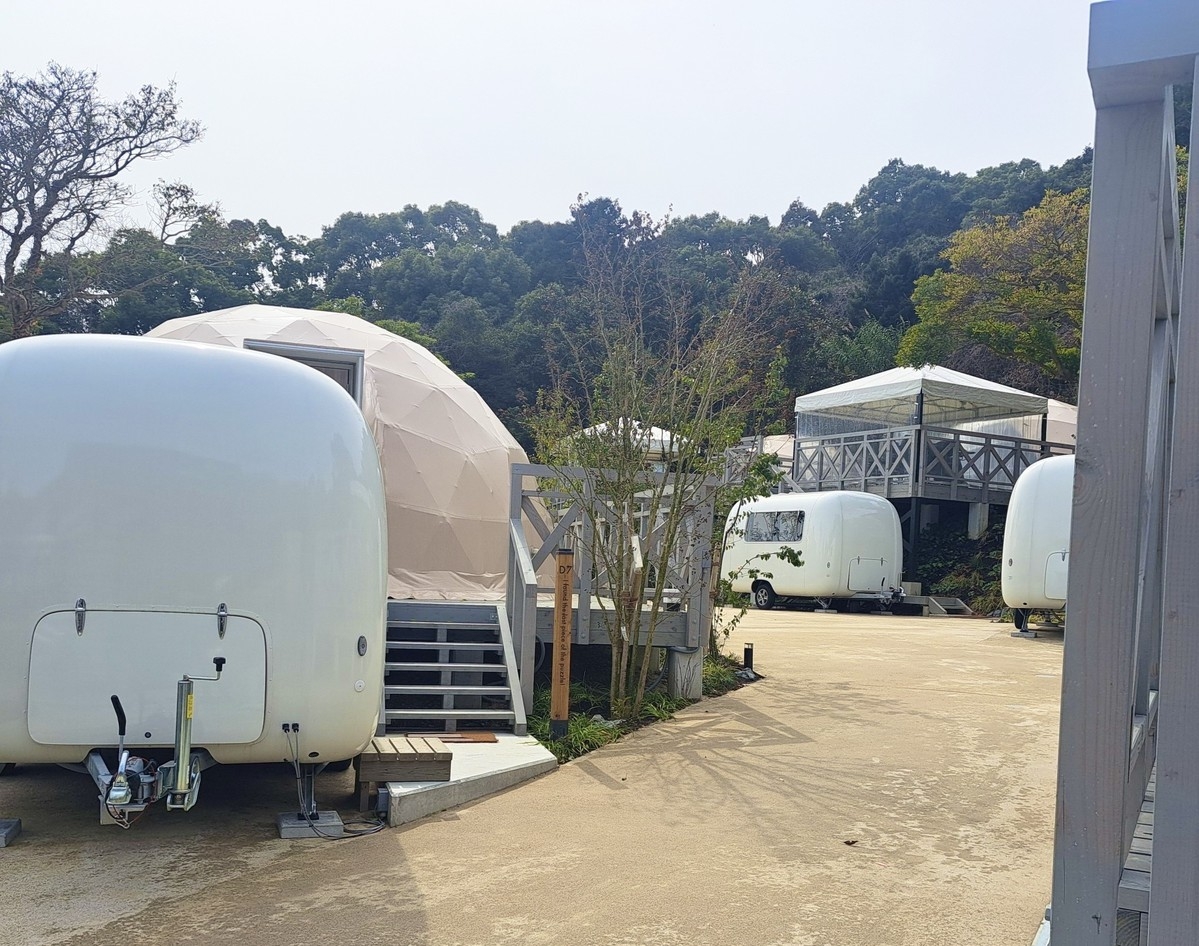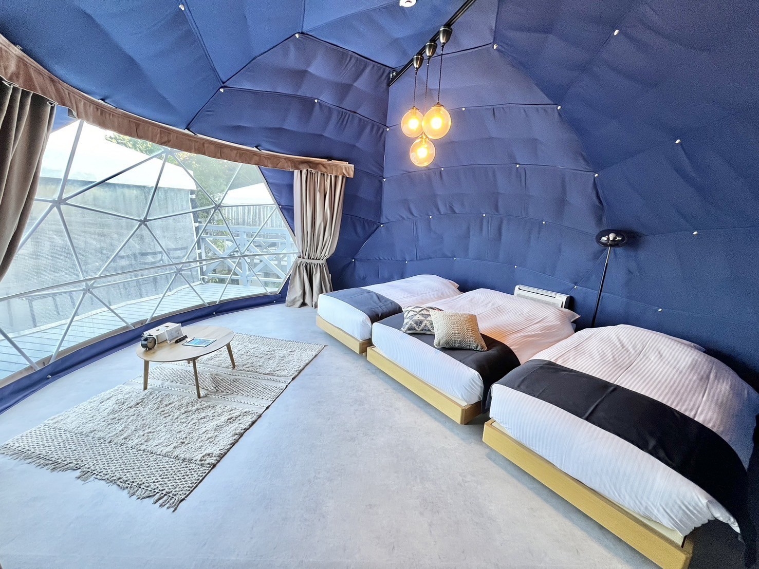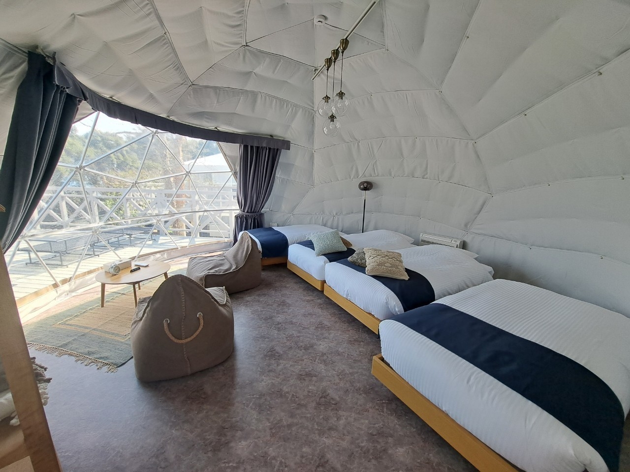 海も山も見渡せるウッドデッキつきのドーム。 セミダブル×1 シングル×2(最大4人)でゆったりと過ごせる空間。