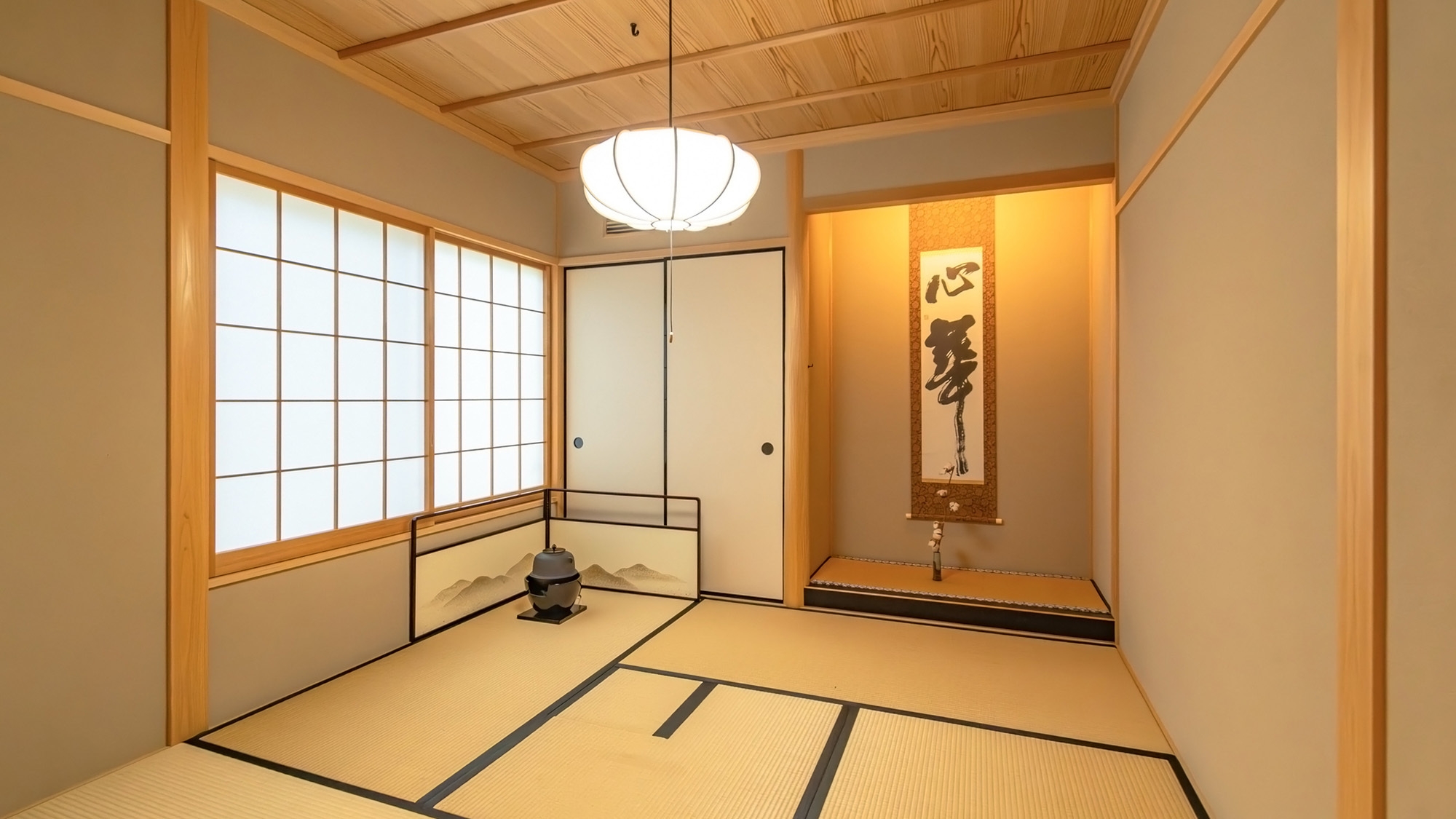 建物は総ヒノキ造り、天井が高く開放感のあるリビングダイニングをはじめ、和の趣きを感じる茶室も完備。