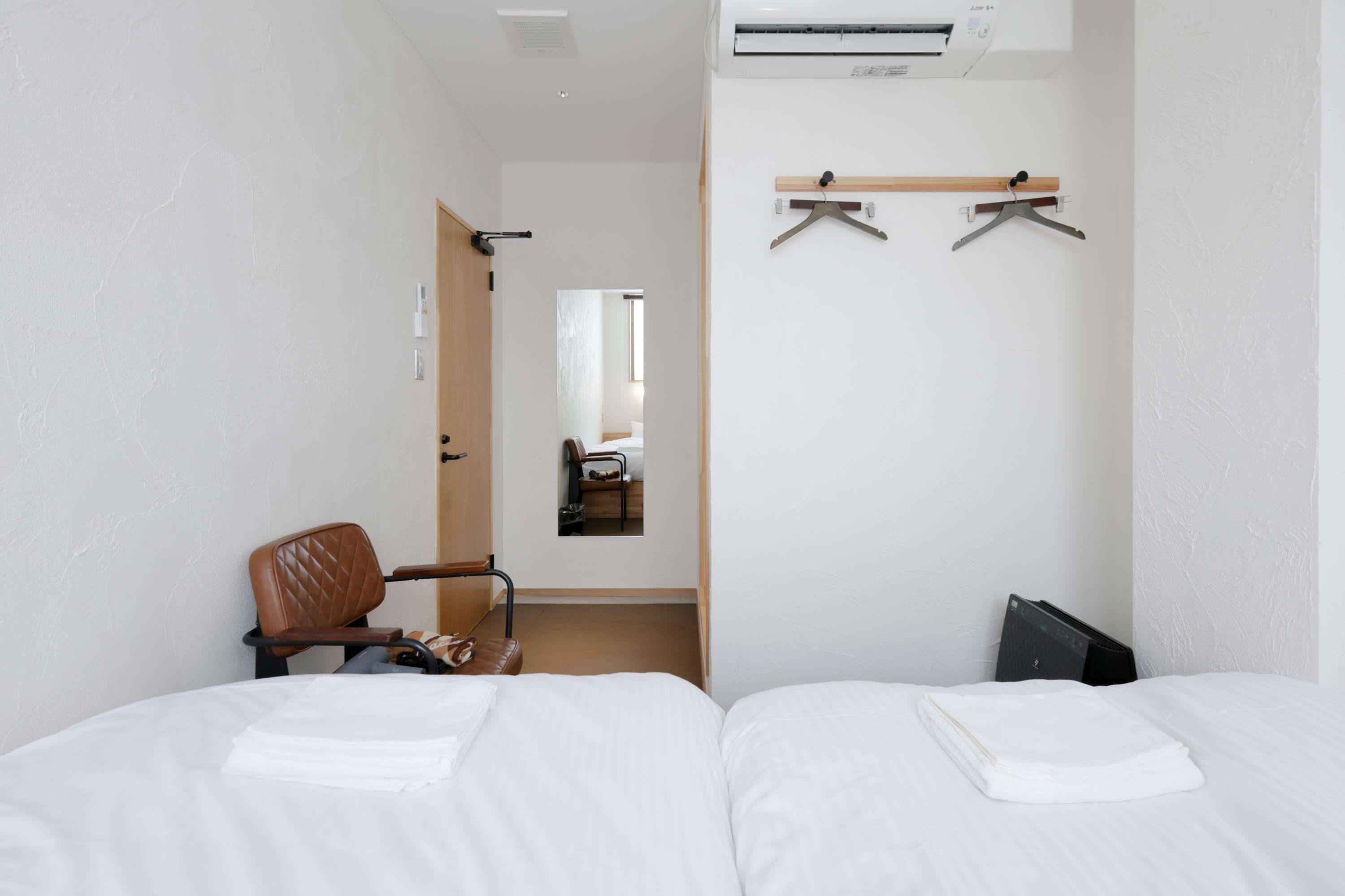 サウナ、シャワー室、トイレが共用の、シングルベッド(ベッド幅100cm)2台のお部屋です。