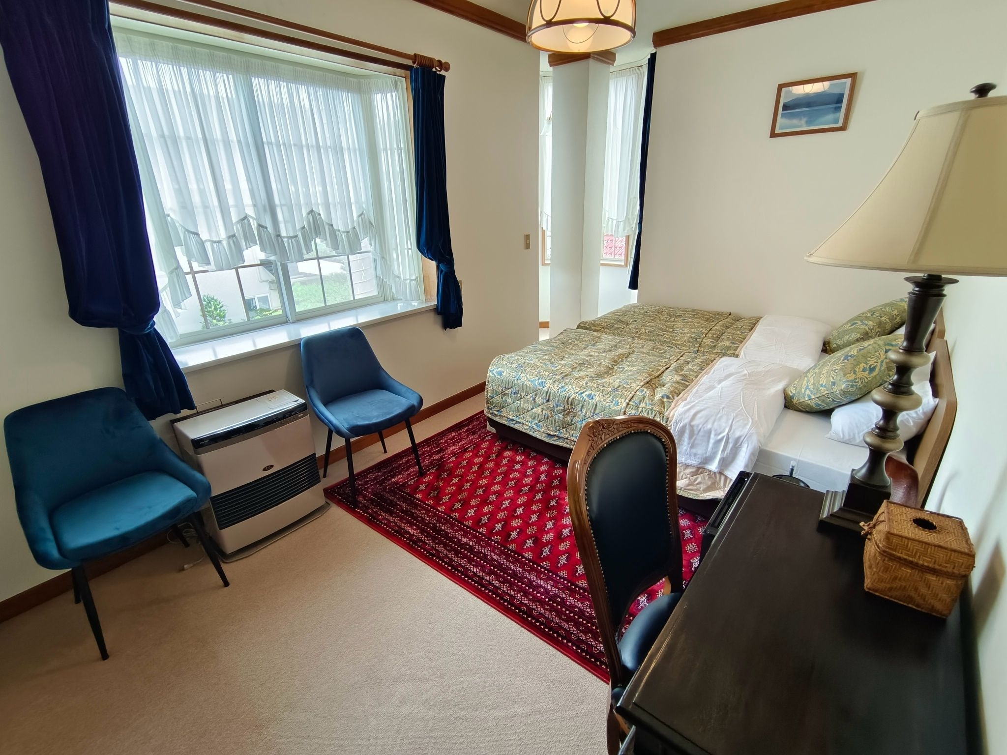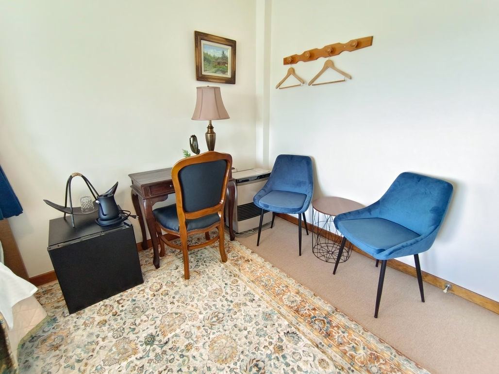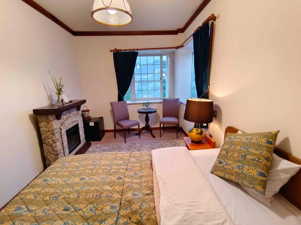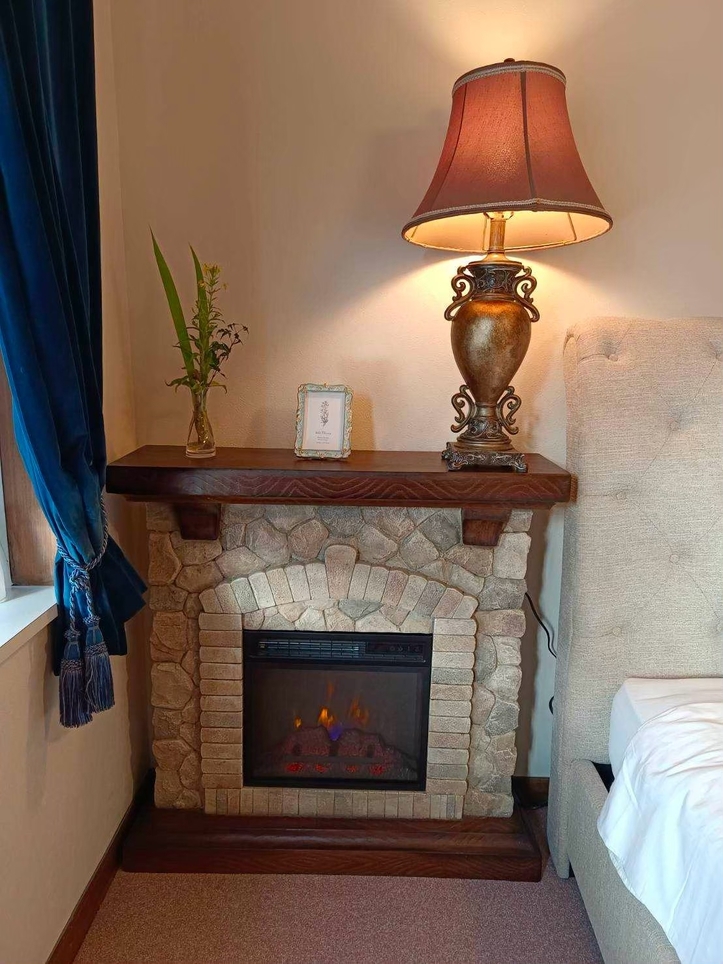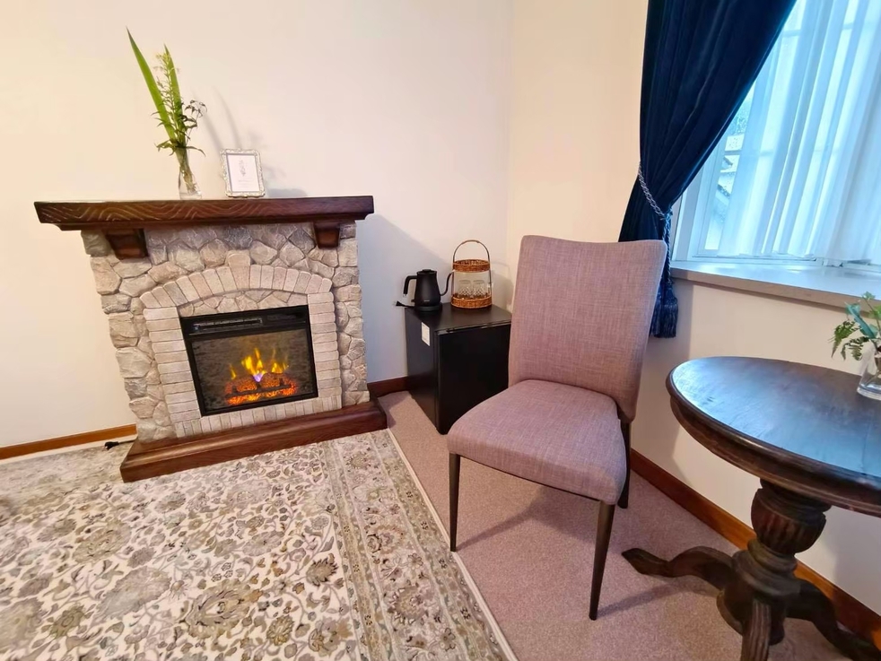 電子暖炉付きのツインルーム。冬には暖炉の炎を眺めながら、特別な時間をお過ごしいただけます。