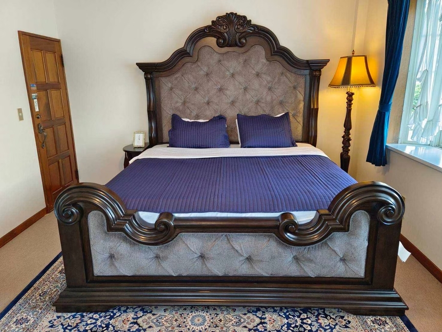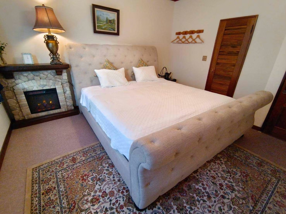 電子暖炉付きのキングベッドルーム。暖炉の炎が揺らめく、温かく心地よい空間で、特別な時間をお過ごしいただけます。
