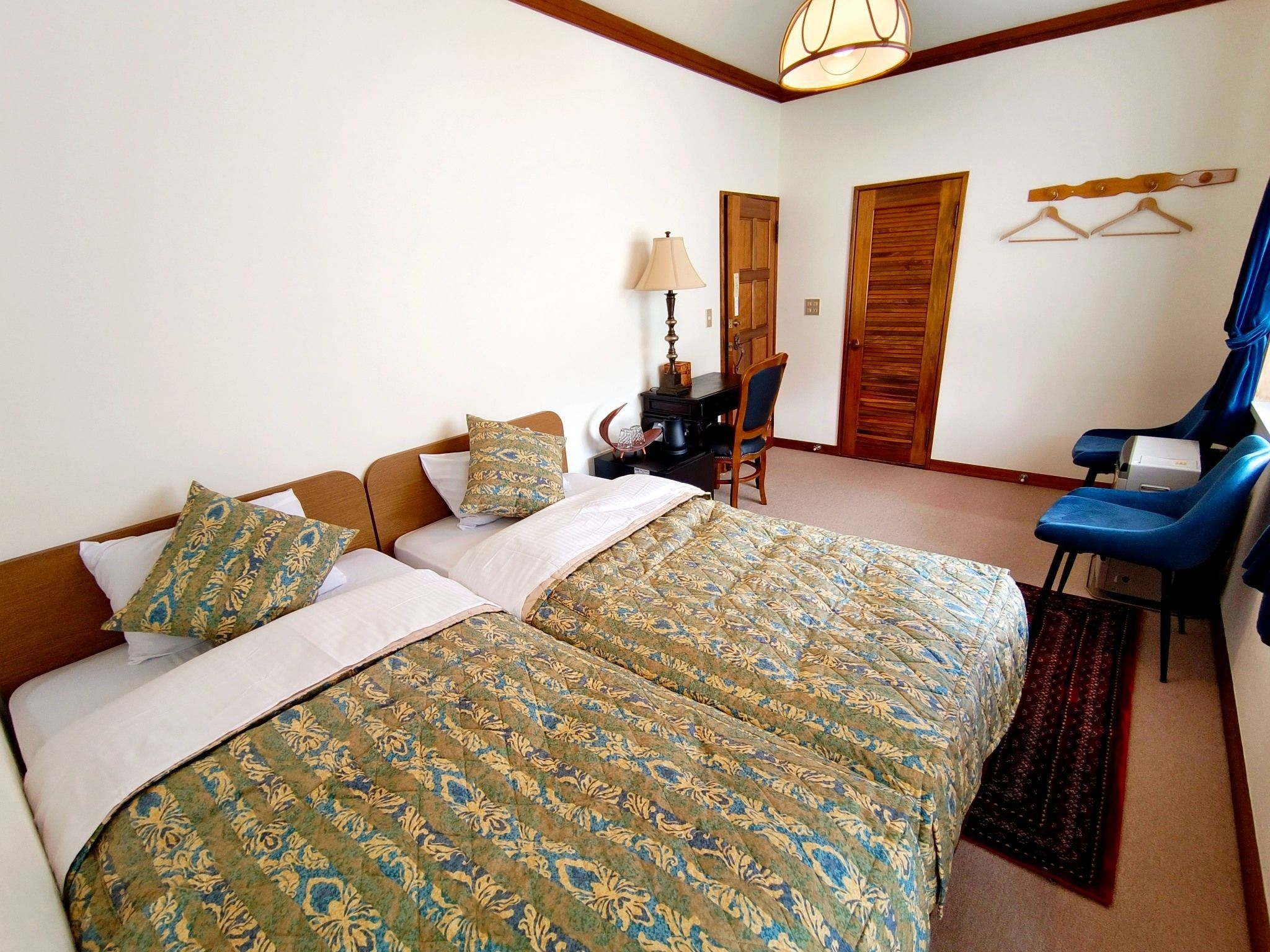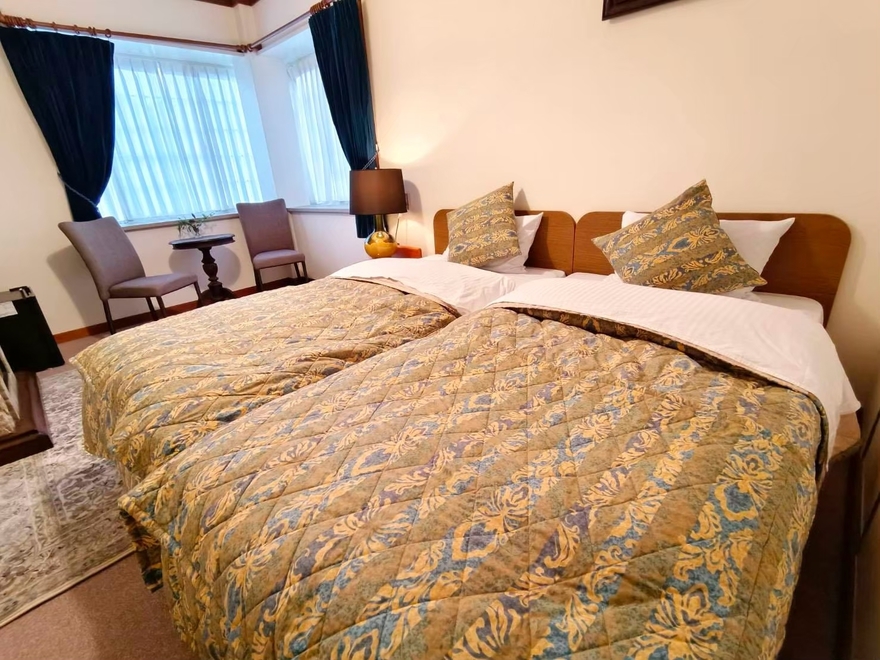 大きな窓から明るい光が差し込む、開放的なツインルーム。シンプルながらも温かみのあるインテリアで、ゆったりとお寛ぎいただけます。