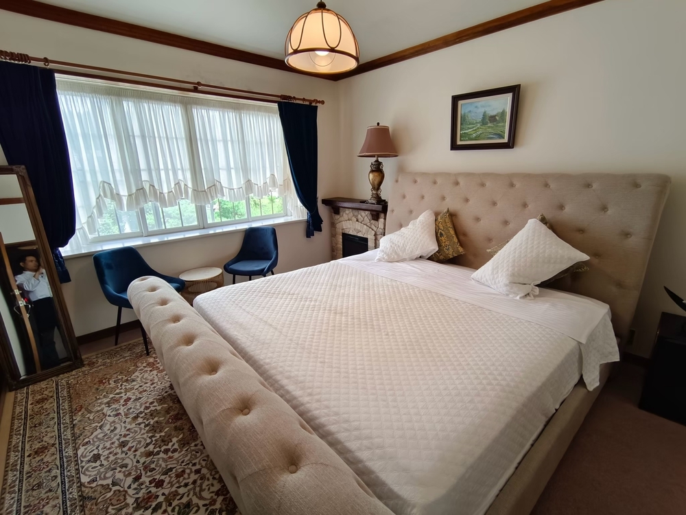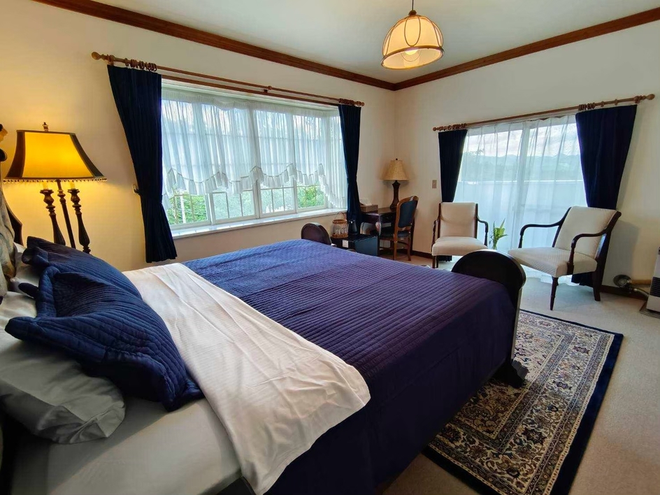 洗練されたインテリアと、落ち着いた色調でまとめられたキングベッドルーム。大きな窓からは、落ち着いた山々を望み、天気の良い日には富士山も顔を覗かせます。日常の喧騒
