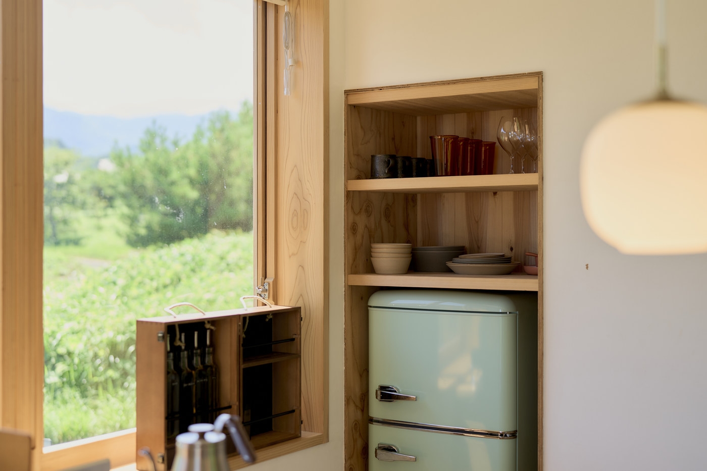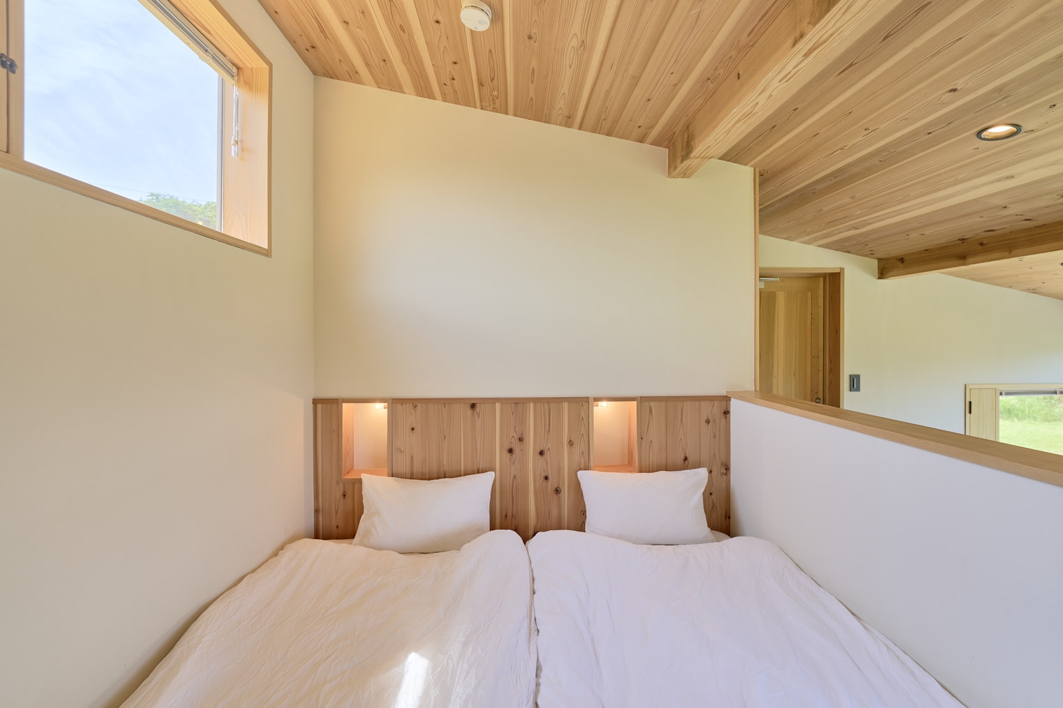 20平米ワンルームの小さな空間ながらも、寝室、キッチン、リビングの機能を分けてゆったりと過ごせる小さな家。窓から差し込む光と、自然を感じる滞在。