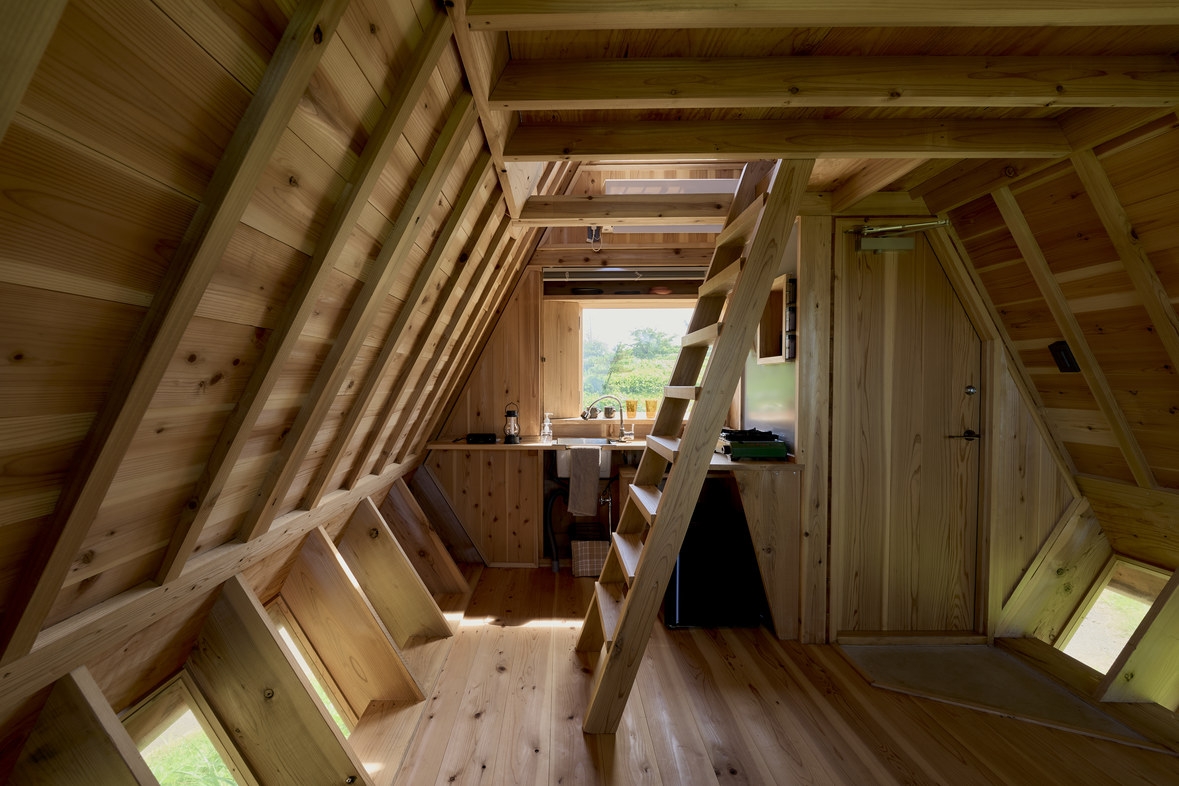 木の実の殻のような屋根の下には、必要最低限の設備をコンパクトにまとめられたリビングとキッチン、寝室のあるロフトのついた隠れ家のような空間。
