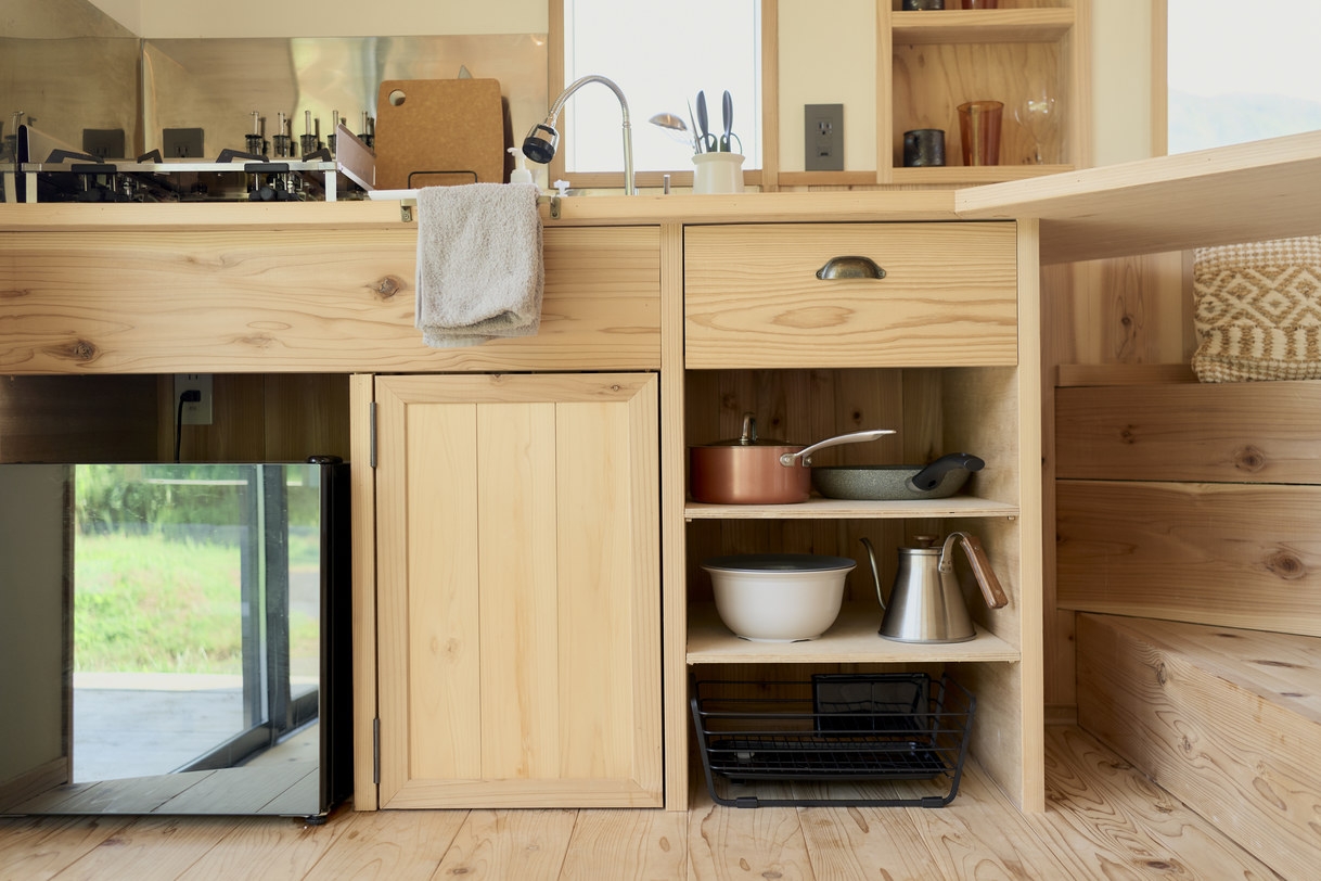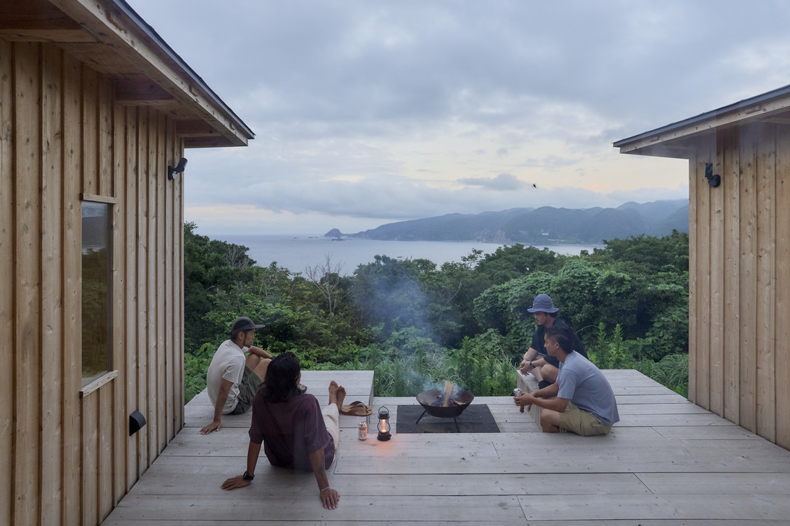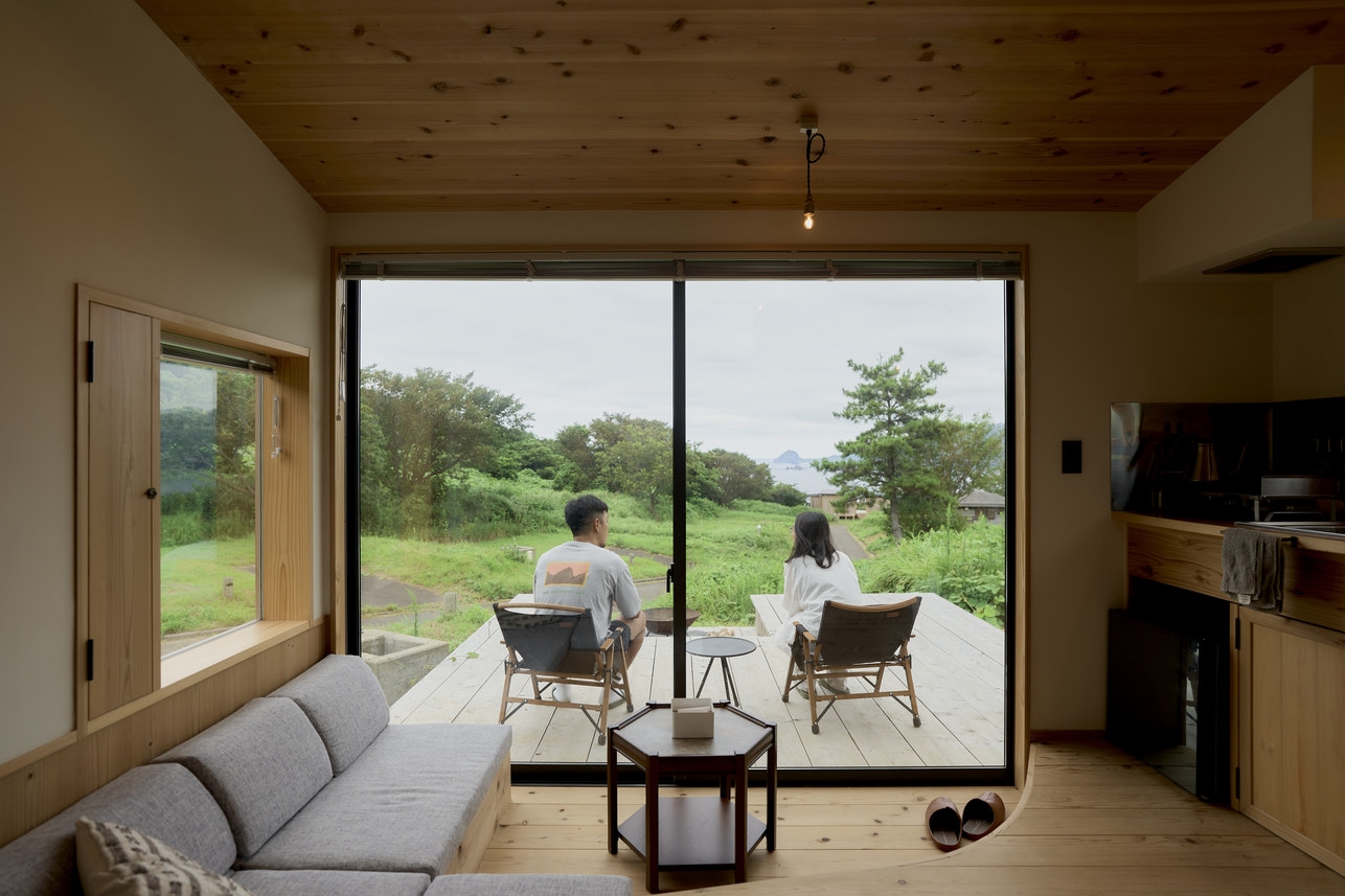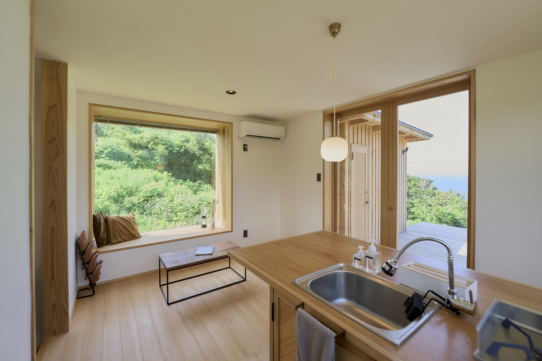 3つの棟に分かれた小さな家。海を望みながらついつい料理をしたくなるリビング棟に、窓に囲まれながら寝れる寝室が2棟。家族や友人と、自然とともにある滞在を。