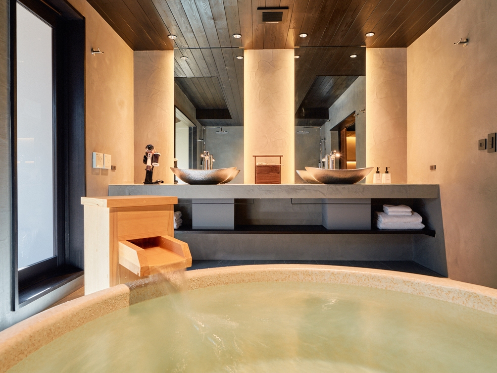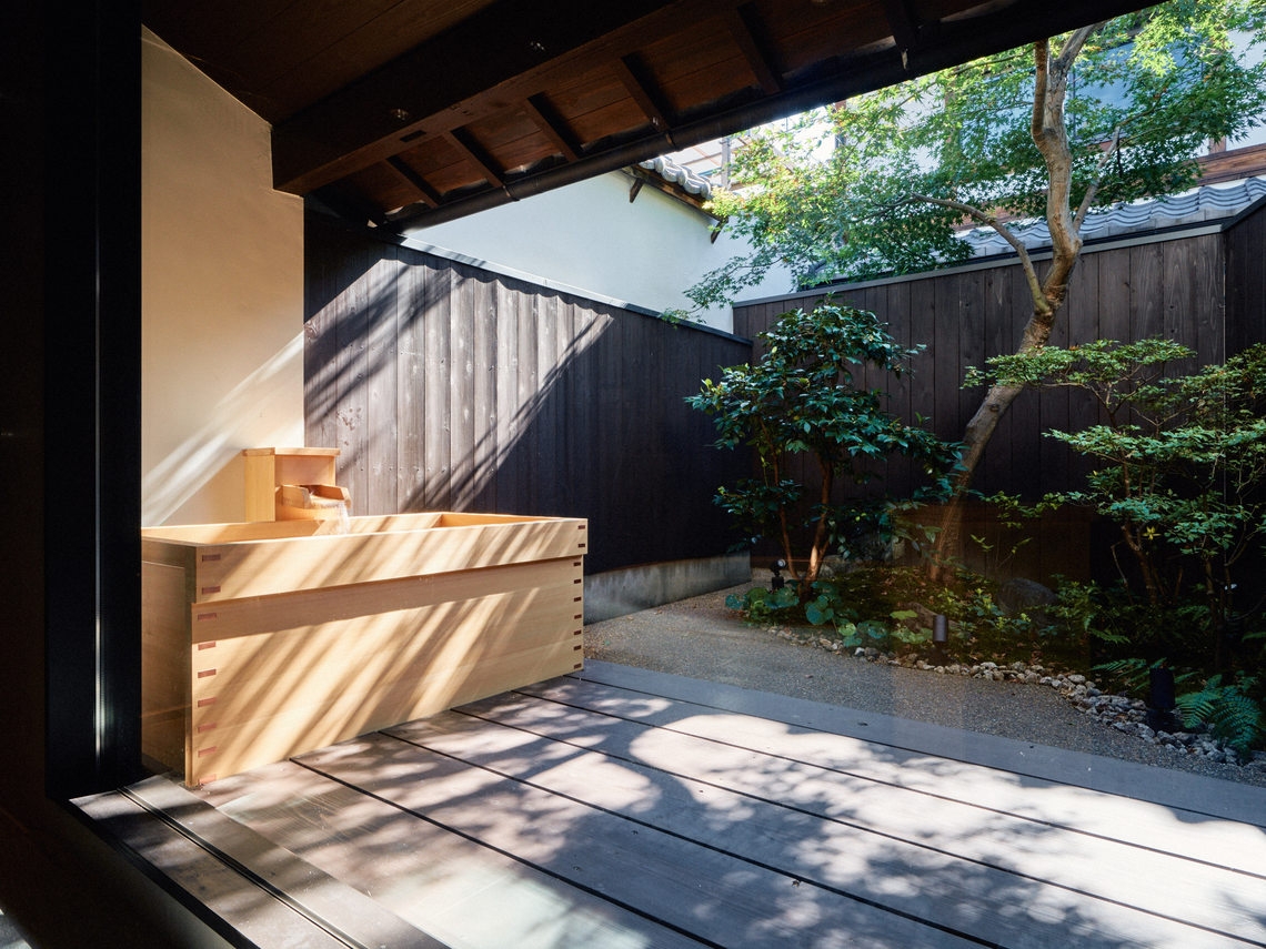 客室露天風呂付の棟です。京都の街歩きで疲れたら、2つの浴槽、信楽焼の内風呂とお庭を眺める檜の露天風呂で体を癒し、京町家の風情を存分にご堪能ください。