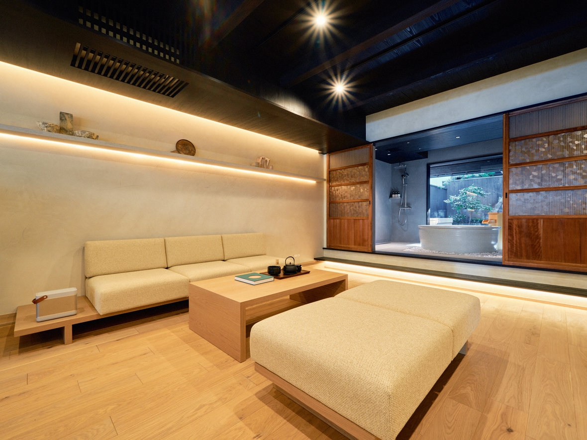 客室露天風呂付の町家です。京都の街歩きで疲れたら、お庭を眺める露天風呂で体を癒し、京町家の風情を存分にご堪能ください。
