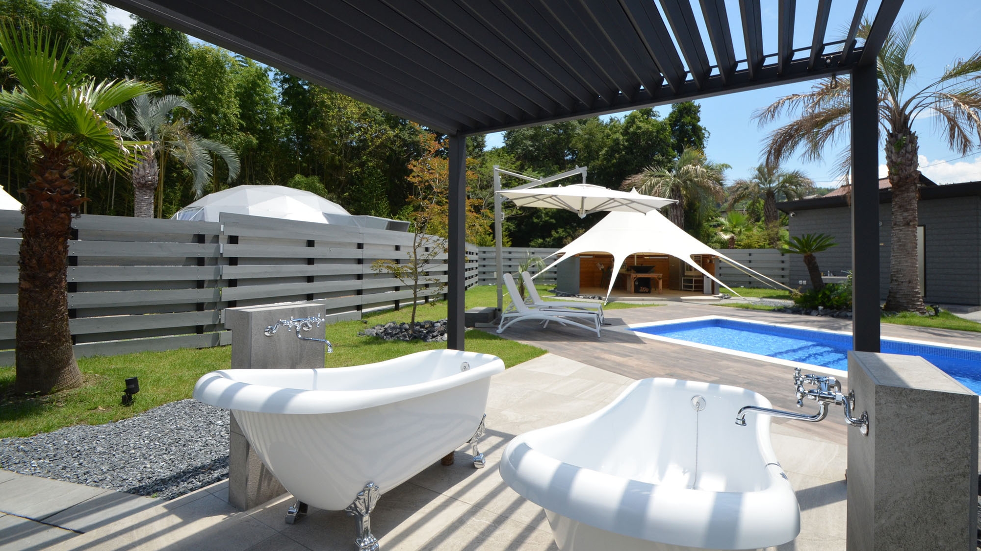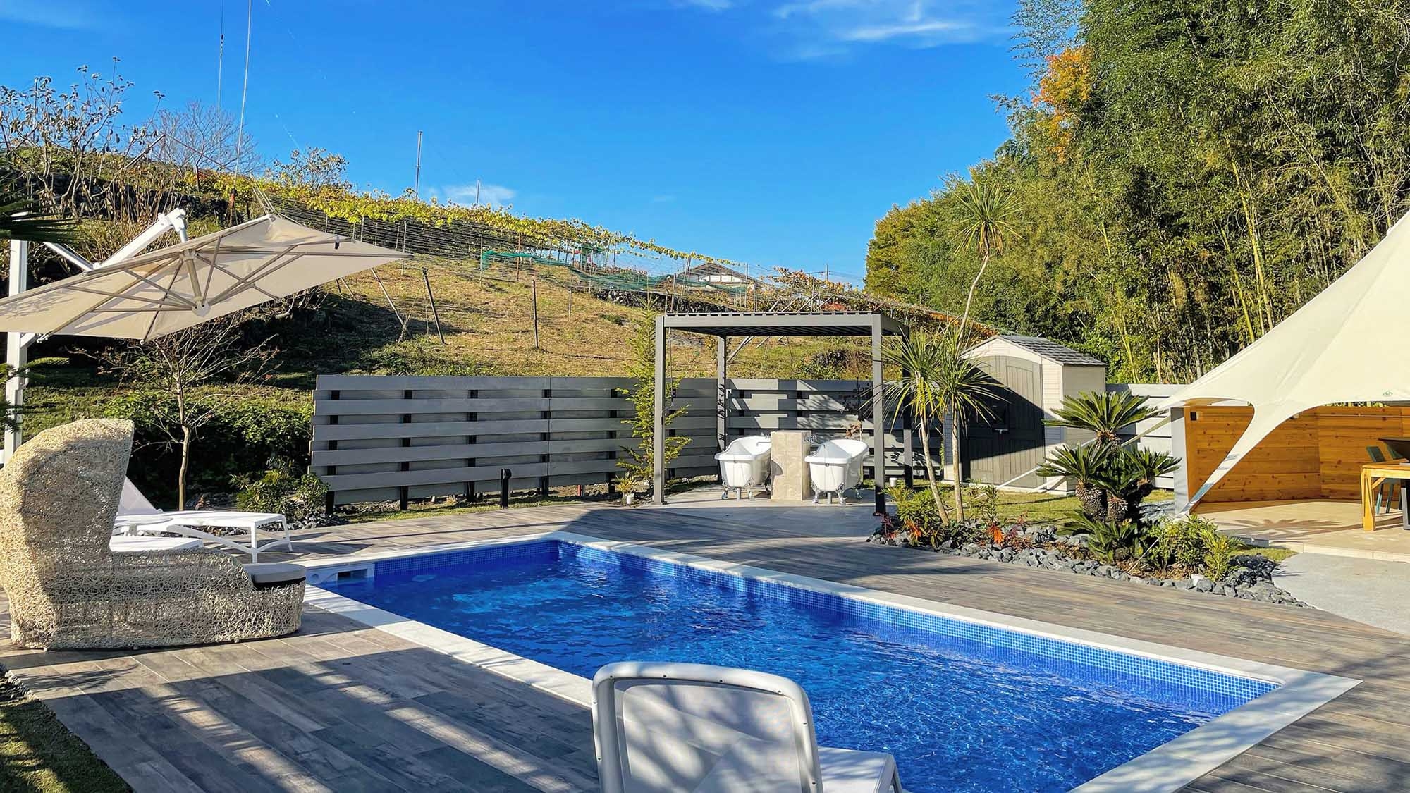 都内から車で約90分。秩父の豊かな自然に囲まれた1日3組限定のグランピングドームで、ラグジュアリーなアウトドアステイをお楽しみください。▼▼▼+RIVERPOOL 埼玉ちちぶ・おすすめポイント▼▼▼(1)専用の温水プール・アウトドアバス・ウォーターガーデンを完備(2)食事スペースでBBQもOK(別料金)(3)80本以上のサービスドリンク付き(4)施設すぐ横に荒川支流の三沢川が穏やかに流れており四季折々の風景も楽しめます(5)『秩父温泉 満願の湯』の温泉チケット進呈(1人につき1枚)(6)バレルサウナ有り(別料金、事前要問い合わせ)【グランピングドームの設備・アメニティ】■直径6.0m 最大高3.0m■Serta社のセミダブルベッド最大4台、テンピュールの枕■エアコン、換気扇、空気清浄機、コンセント、照明■無料Wi-Fi■別棟「アクアルーム」に専用のバストイレ完備■アメニティタオル、バスタオル、ボディタオル、歯磨きセット、ナイトウェア 等*シャンプー・コンディショナー、ボディソープ・ボディローションはオムニサンス*ReFa製ドライヤーとヘアアイロン*MINUCAの基礎化粧品■温水プール■アウトドアバス、ウォーターガーデン■専用の食事スペース冷蔵庫、ケトル、電子レンジ、照明、コンセント、スピーカー、カトラリー、テーブルセット、スター型タープ■無料駐車場【有料オプション】ご利用希望の場合は事前にご連絡ください(料金は現地にてお支払い)■夕食時炭火BBQグリル(網焼き):5,000円/回■朝食時ホットプレート:1,000円/回■バレルサウナ:1組40,000円 1日1組限定、滞在中いつでも利用可【ご予約されるお客様へ】■ペット同伴の宿泊はお断りしております■火気等のお持ち込みは禁止(卓上ガスコンロのみ持ち込み可)■プライベートサイト内では花火不可(公共スペースで利用可能)■大音量スピーカーの持込禁止■プール利用時間:7時〜22時(アウトドアバス含む)■サイト内では水着着用必須です。レンタルはしていませんので水着は各自でご持参ください
