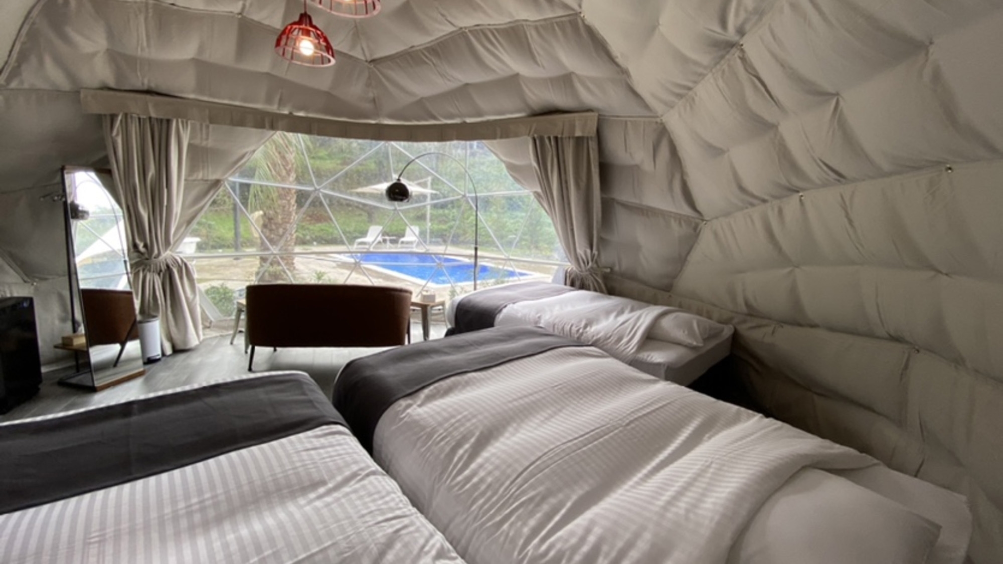 プライベート温水プールを見ながら寛げるラグジュアリーな空間。Serta社のセミダブルベッド4台を設置。バス・トイレは各ドーム併設のアクアルームをご利用ください
