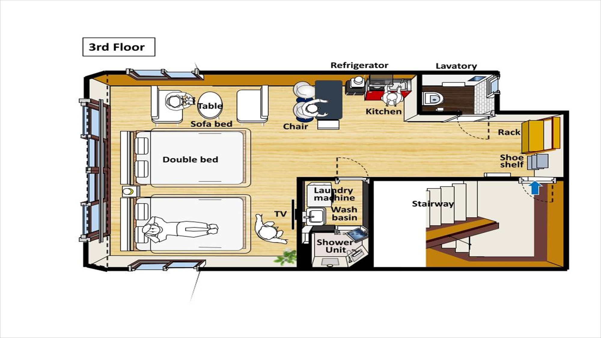 シャワー・トイレ・キッチン・洗濯乾燥機・無料WiFi・ダブルベッド2台/ダブルサイズのソファベッド1台