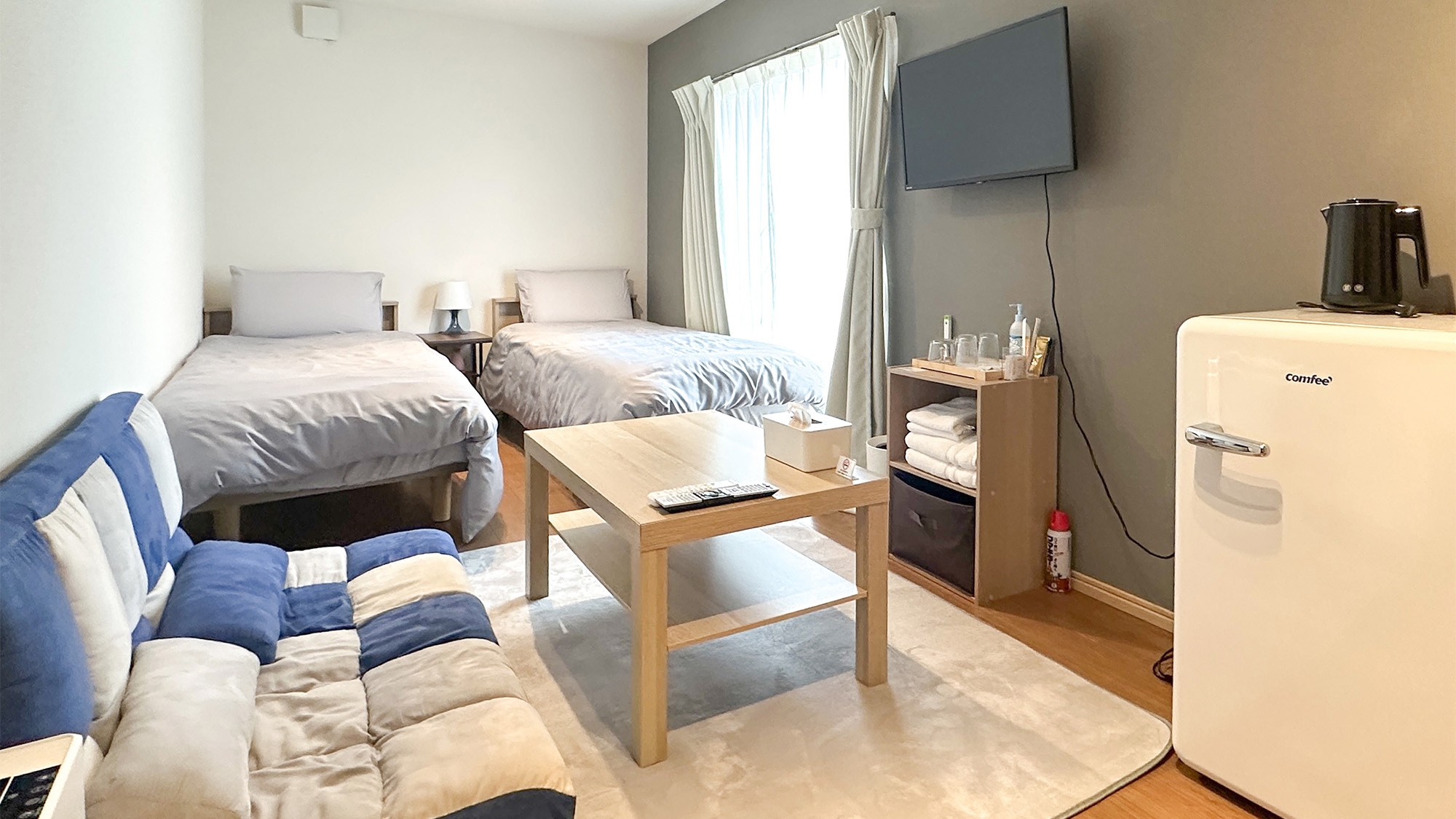 テレビ/エアコン/冷蔵庫/ソファ/テーブル/湯沸かしポット/空気清浄機/無料Wi-Fi