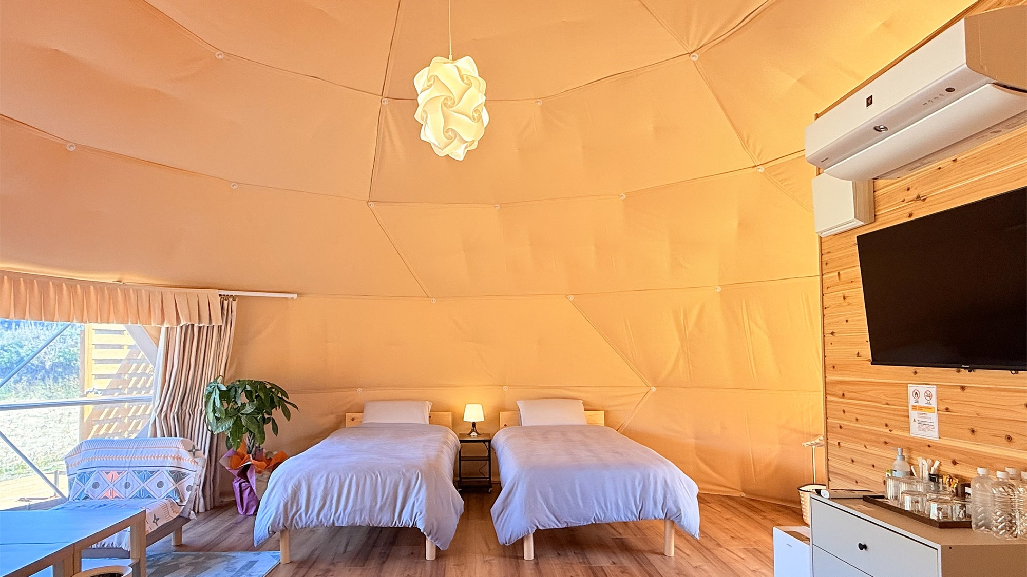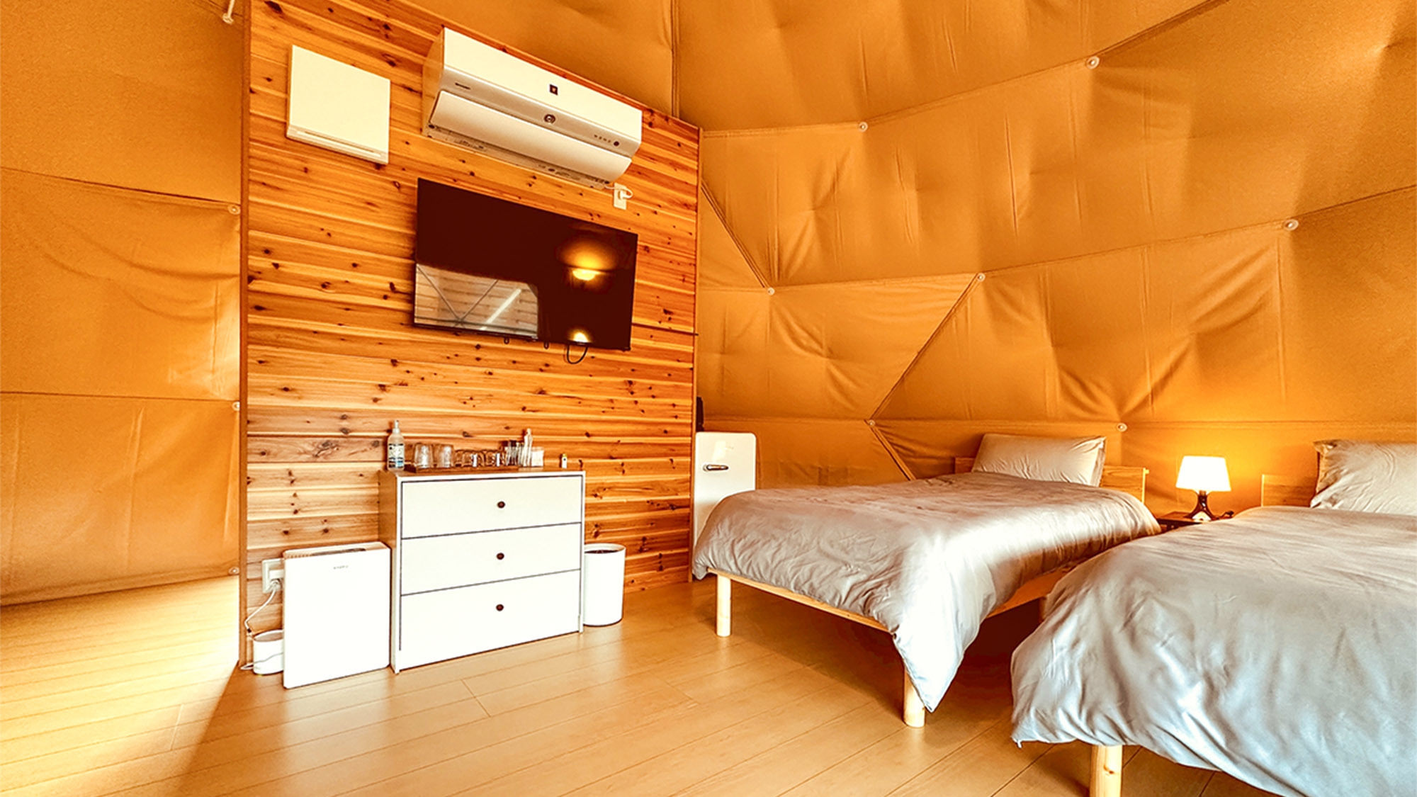 シングルベッド4台とエキストラベッド1台完備のグランピングテント。別棟のバストイレは客室専用のためグランピング初心者でも安心!無料Wi-Fi・エアコン・テレビ有