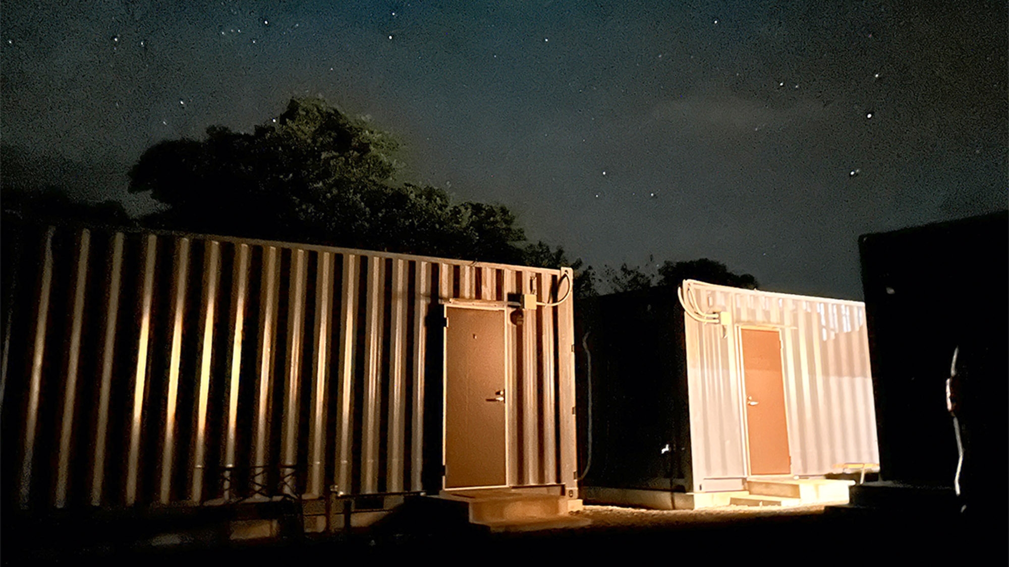 シングルベッド2台とエキストラベッド1台完備のコンテナ客室。ソファ・テーブル完備。カップルや友人同士の利用にも最適!別棟のバストイレは客室専用です。※2名様推奨