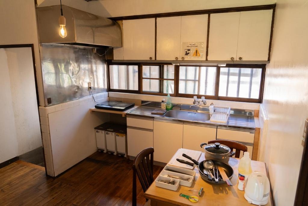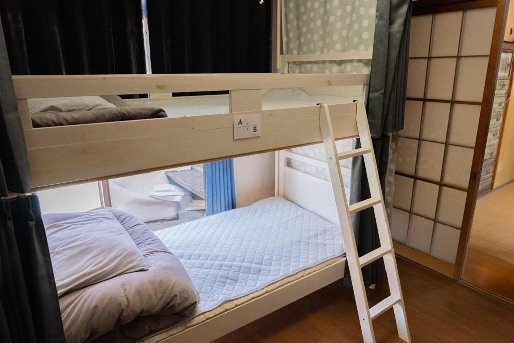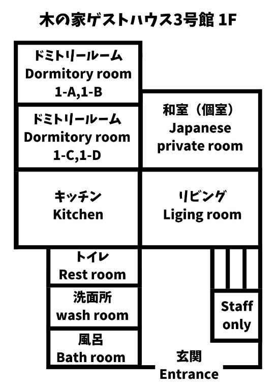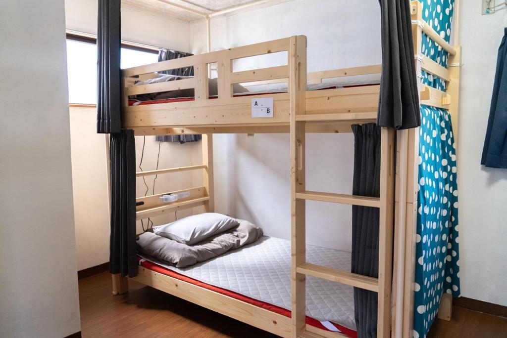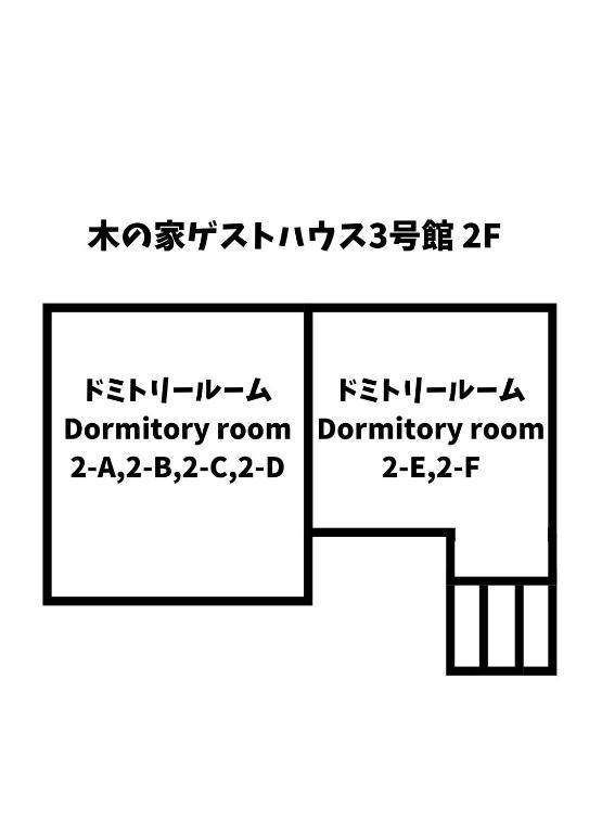 木の家ゲストハウス3号館の男女混合ドミトリールームです。最大で10人まで宿泊できます。お風呂、お手洗い、キッチン、リビングなどは共用スペースです。他のお客様がいらっしゃる場合は共用でご利用ください。