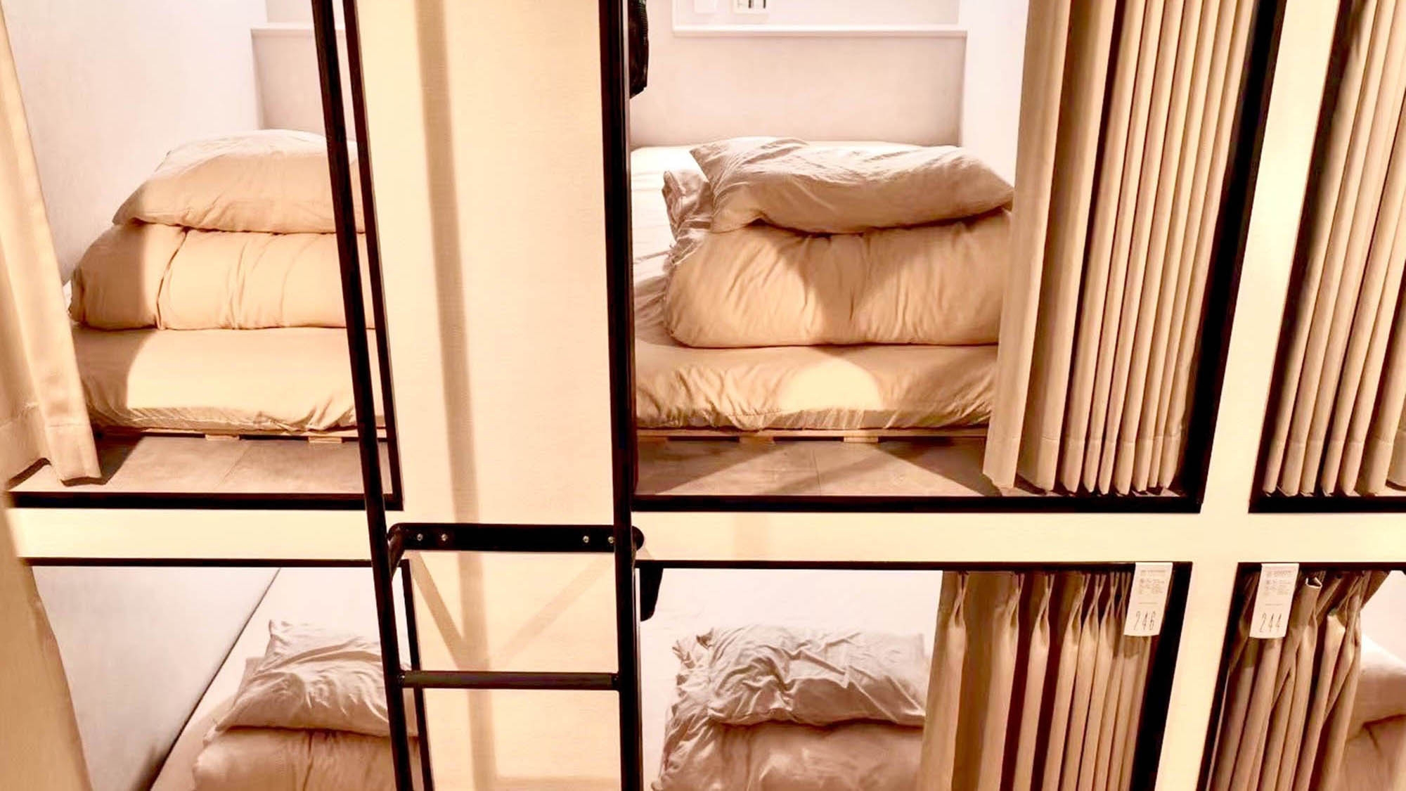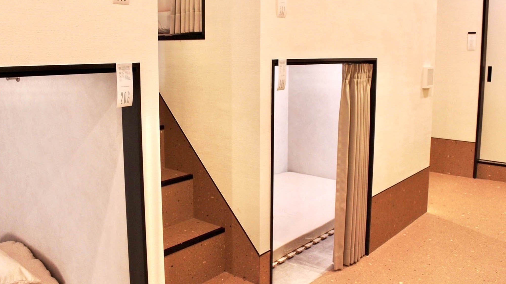 ■客室は旅館業法上の簡易宿所にあたるため、各カプセルユニット、個室を施錠することができません。カーテンで仕切られているため