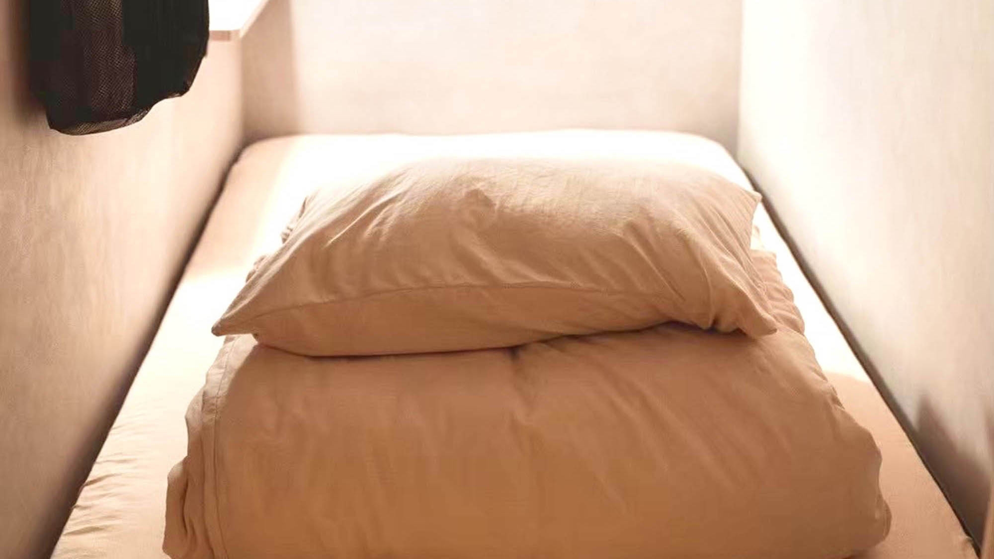 上下段に分かれた横型カプセルタイプの1スペース。枕元にコンセントと調光照明を完備。バスタオル、フェイスタオル、バスマット、セパレートタイプのパジャマをご用意