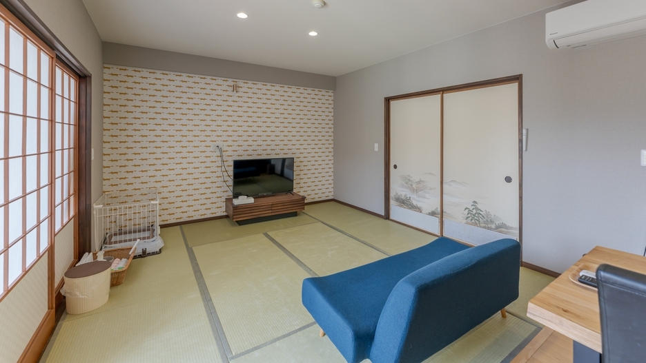 2024年1月完成。ワンちゃんと一緒にゆったりお過ごしいただける、半露天風呂付きのわんちゃん専用和室10畳。 眺めの良い3Fの和室で、リラックスしたひとときを。
