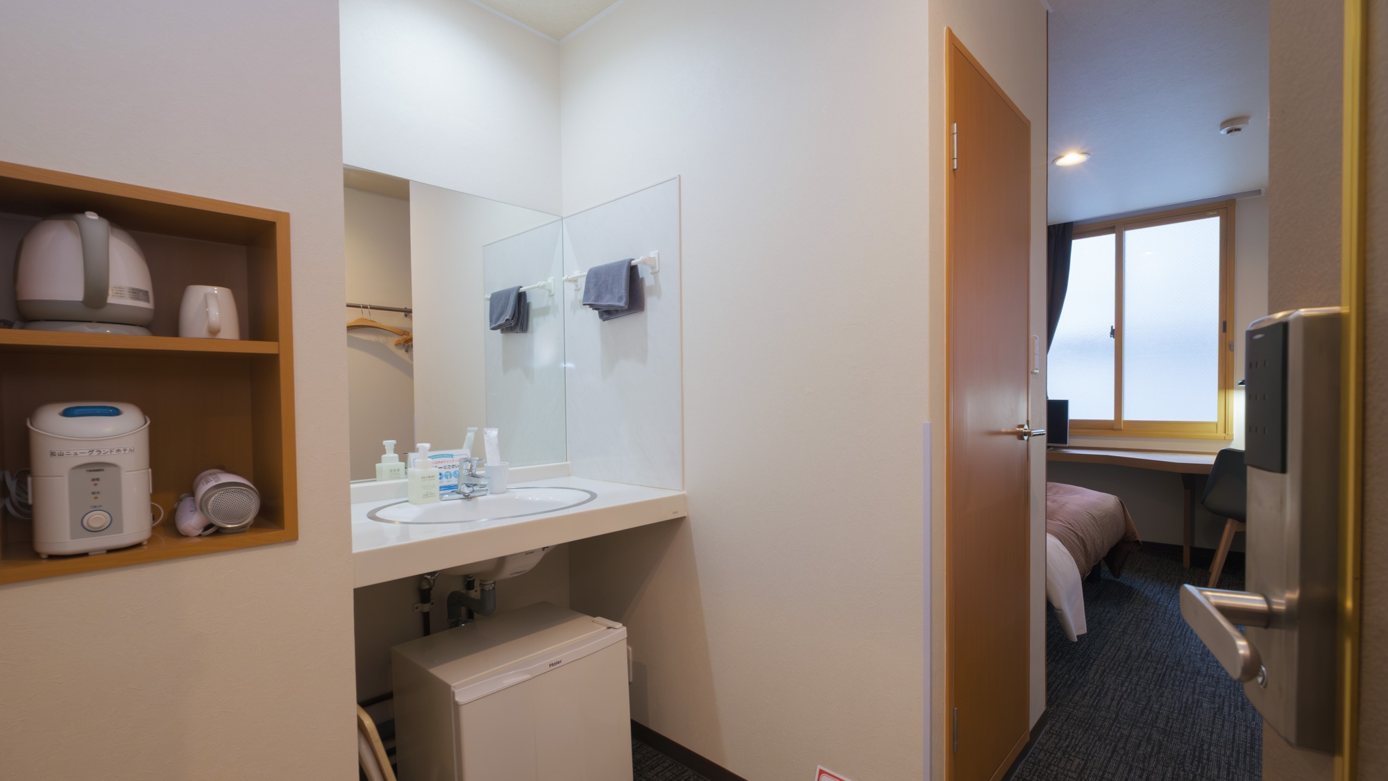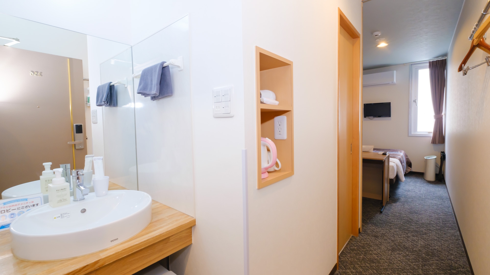 【リニューアル客室】13平米の利便性重視の設計。客室に浴室はありませんが天然温泉大浴場をご利用頂けます。温水洗浄便座・空気清浄機・高速Wi-Fi完備※添い寝不可