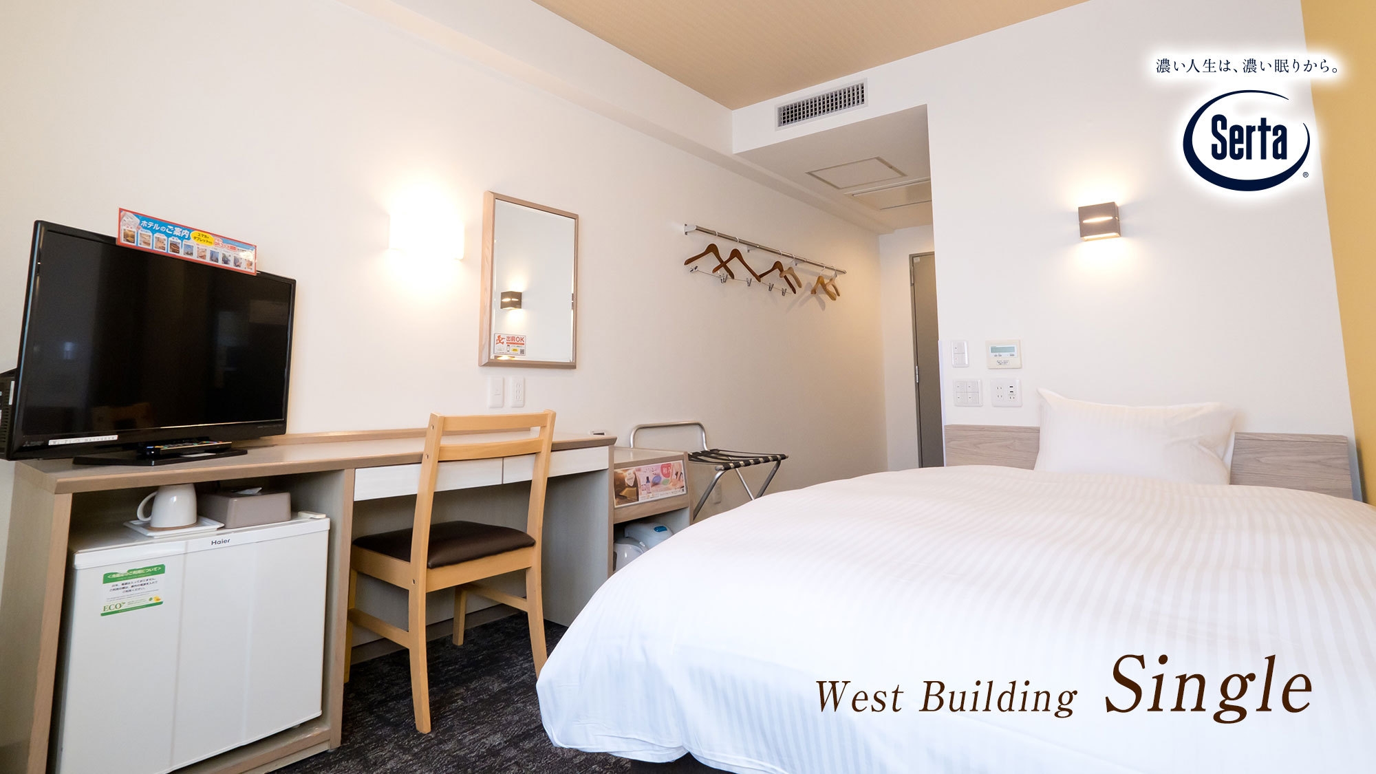 【リニューアル客室】10平米の機能的シングル。客室に浴室はありませんが天然温泉大浴場をご利用。頂けます。温水洗浄便座・空気清浄機・高速Wi-Fi完備※添い寝不可