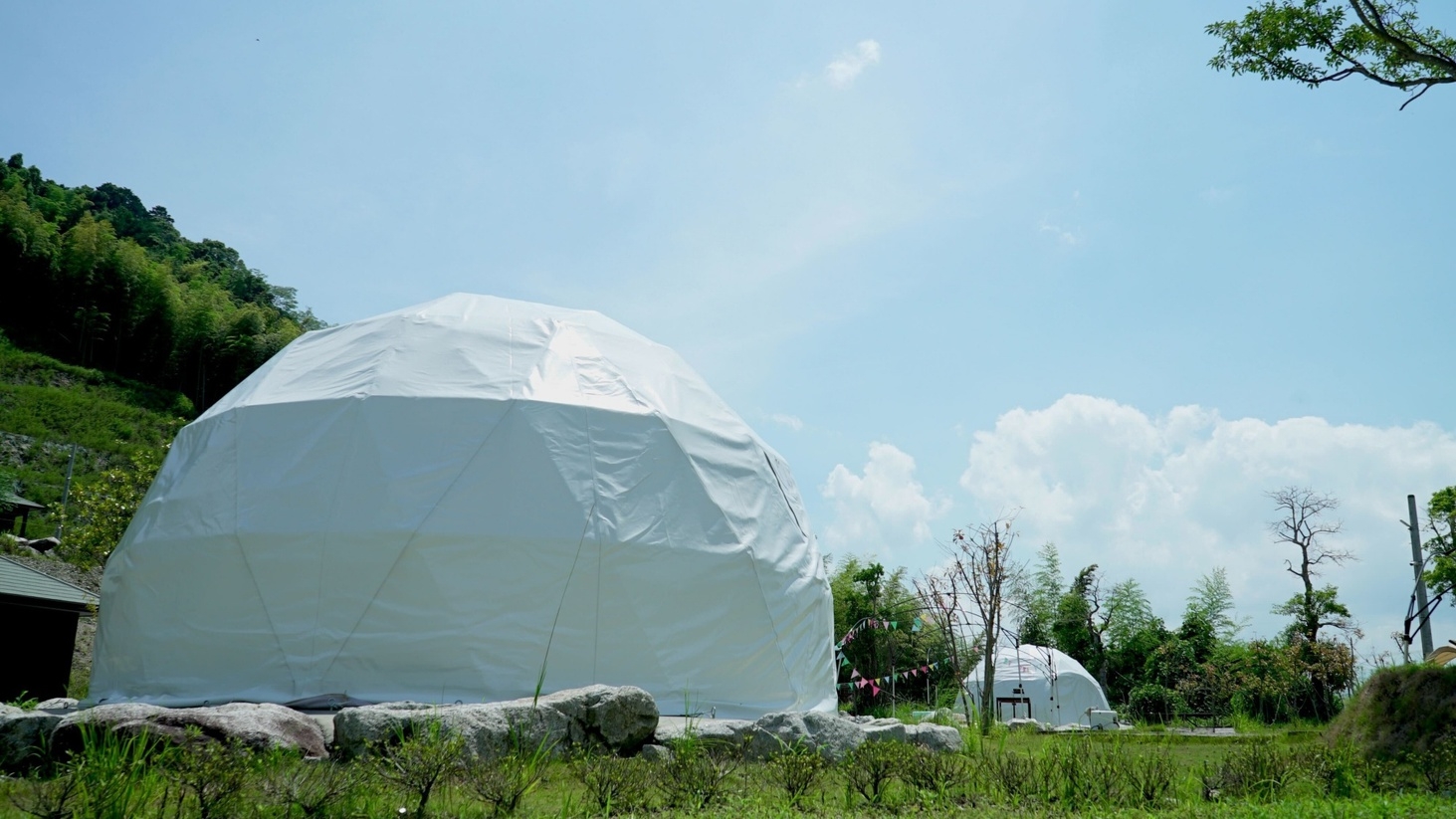 鮮やかなグリーンが自然に溶け込む、可愛らしい大型ドームテント。 全棟エアコン・サーキュレーター・ストーブ完備で、オールシーズン快適にお過ごしいただけます