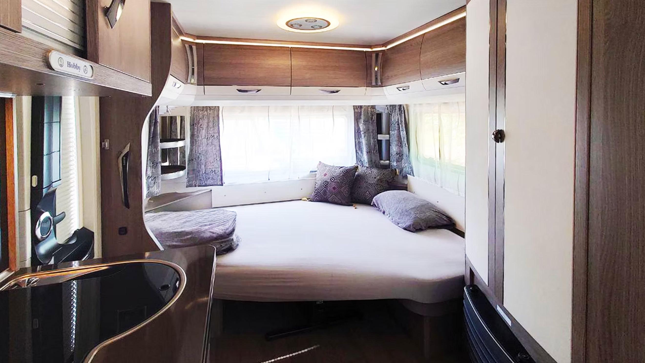 欧州大手キャンピングカーメーカー「Hobby」社の洗練されたドイツ製トレーラーハウス。シングルベッド×2、変形シングルベッド×1