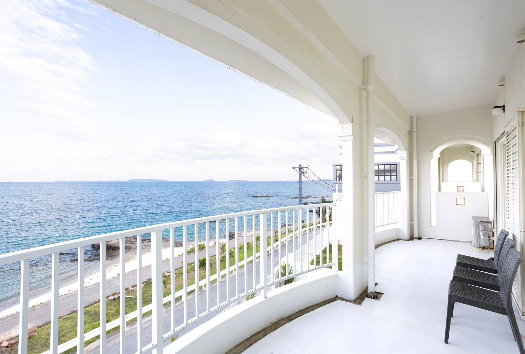 沖縄の青い海と空に映える白壁のヴィラ。