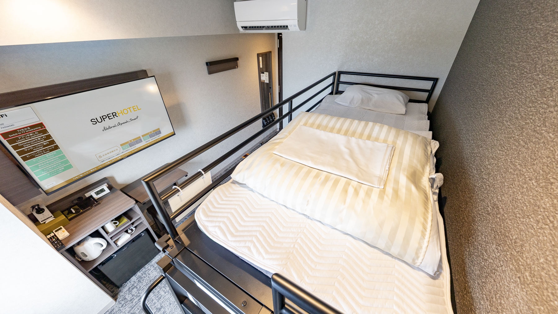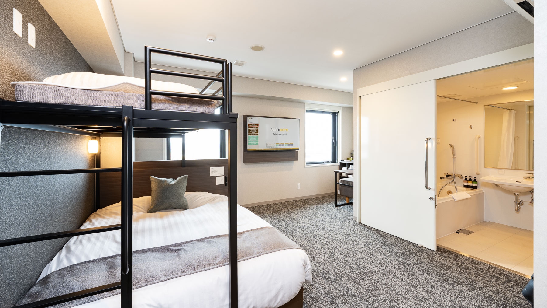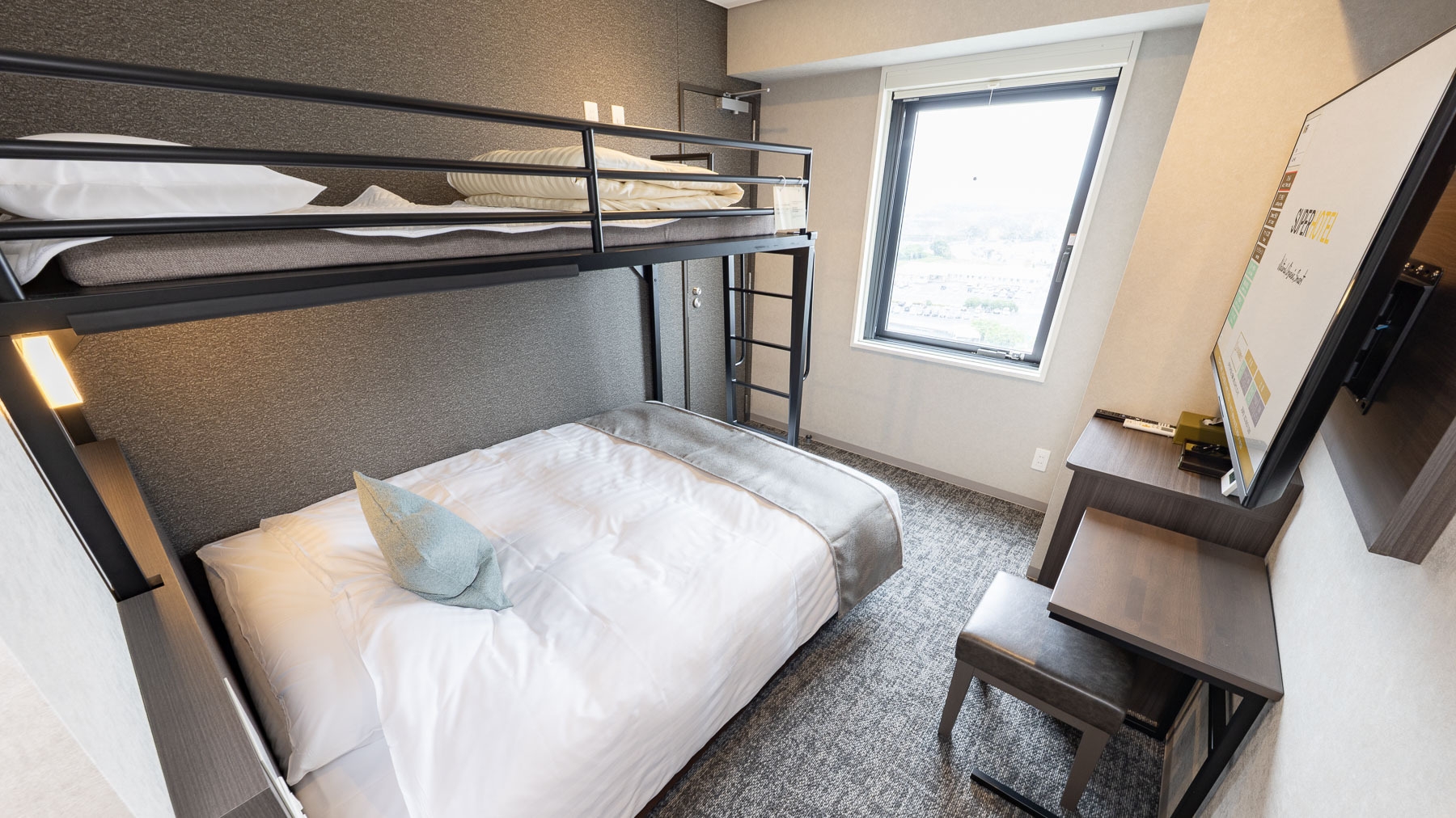 ダブルサイズのワイドベッドとお子様に人気のロフトベッド付の【スーパールーム】です。ご家族にお勧めです。