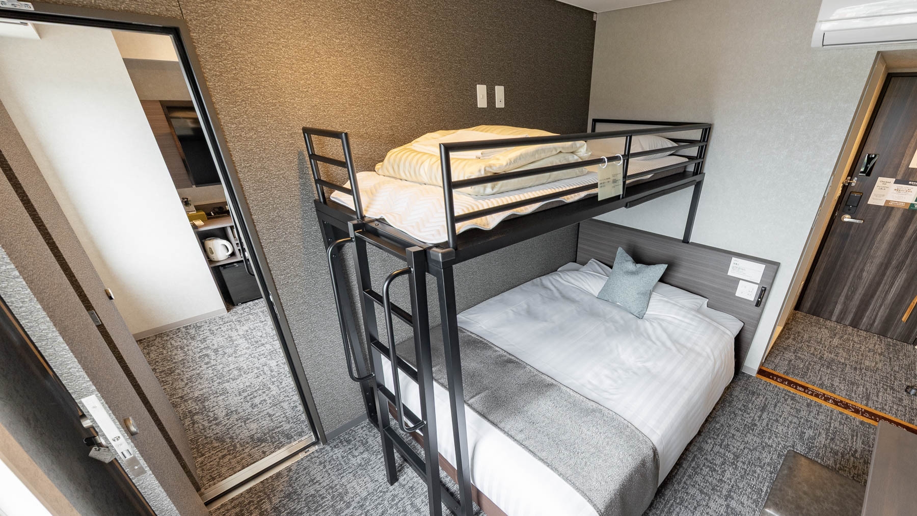 ダブルサイズのワイドベッドとお子様に人気のロフトベッド付のスーパールームが2部屋繋がった【スーパールームコネクティング】です。