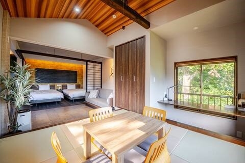 伊豆(伊東)宿泊 一棟貸切ヴィラ La place EN-ラフ゜ラスエン-へようこそ。 都会の喧騒を離れた静かな環境で、特別なひとときをお過ごしください。温泉貸切のこのヴィラは、山の美しい景色を楽しむことができ、心身共にリラックスする絶好の場です。ヴィラ内は和洋折衷のデザインで、趣のある空間が広がっています。温泉で癒された後は、広々とした部屋でゆったりとお過ごしいただけます。 【ご予約条件】 ・1部屋の最低宿泊人数は2名様から、最大6名様までご利用可能です。 ・全館禁煙のため、快適にお過ごしいただけます。 ・インターネット接続可能なので、お仕事やリラックスタイムにも便利です。