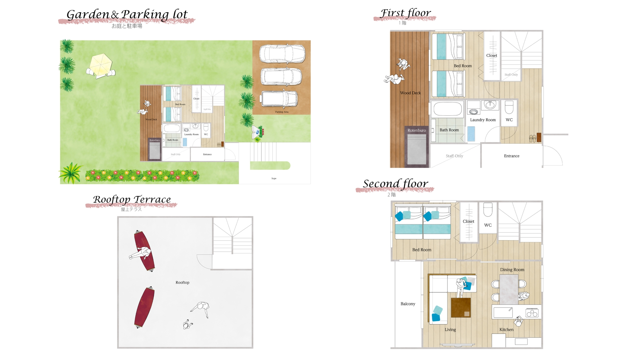 2階建て2LDK+屋上+庭付き(最大8名)/ 駐車場3台(無料)/ セルフチェックイン(非対面)/ Free Wi-Fi / 禁煙 / ペット不可