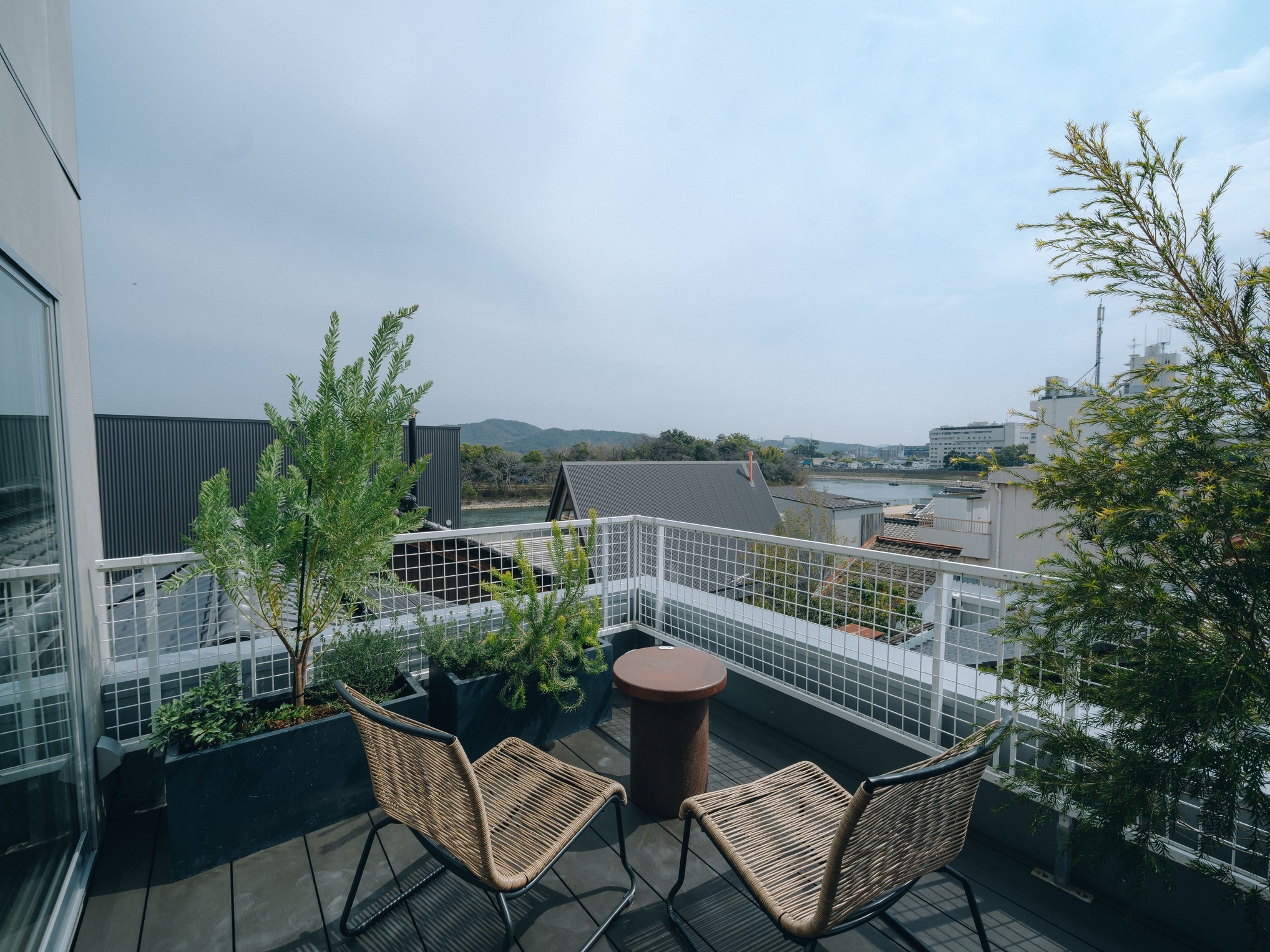 テラスから旭川や岡山城を望むことができるお部屋