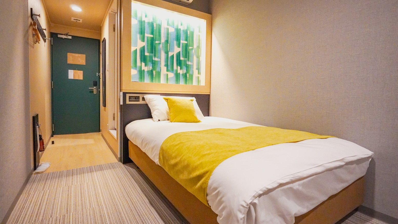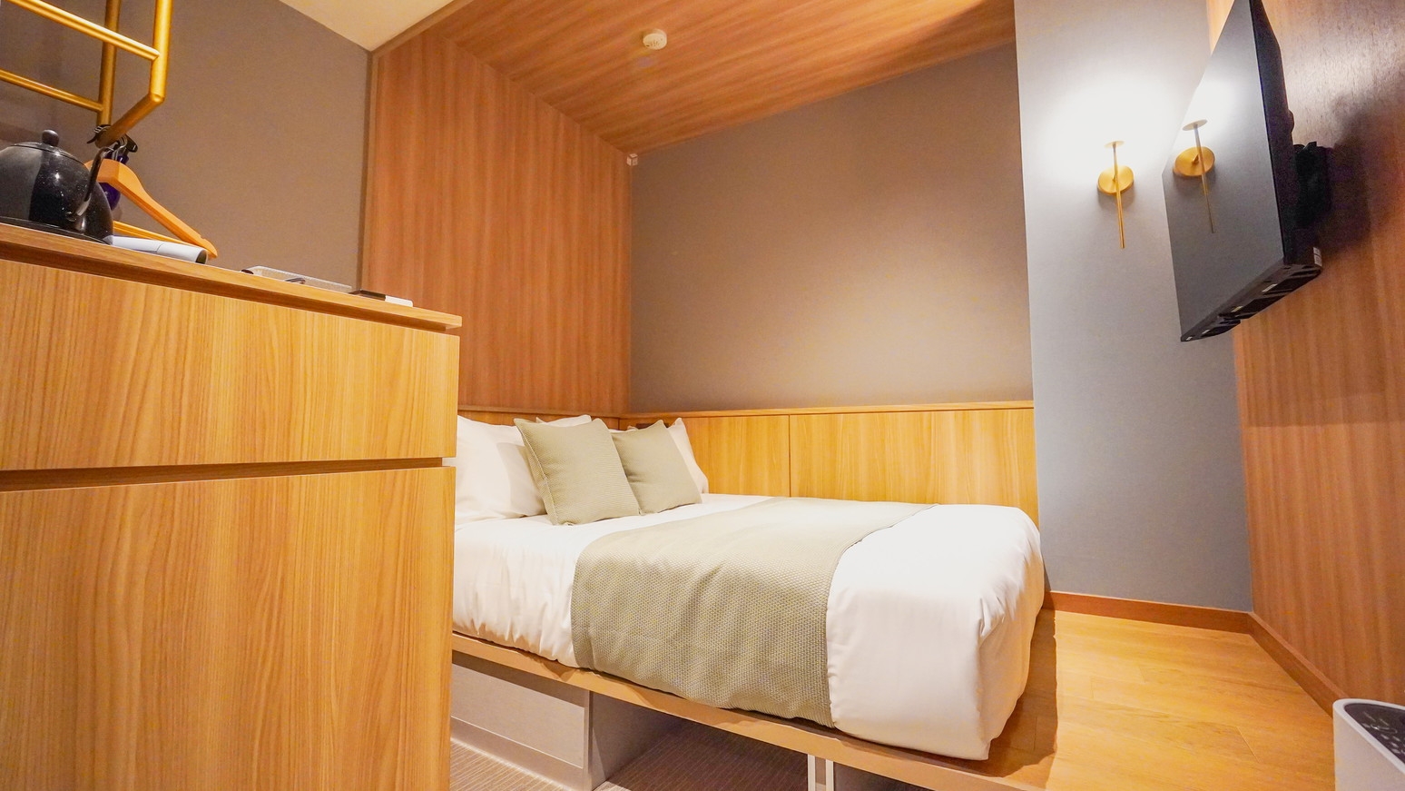 120cmのベッドでおくつろぎいただきながら、必要な設備が揃った空間で快適にお過ごしいただけます。リラックスできる落ち着いた雰囲気でビジネスや一人旅に最適です。