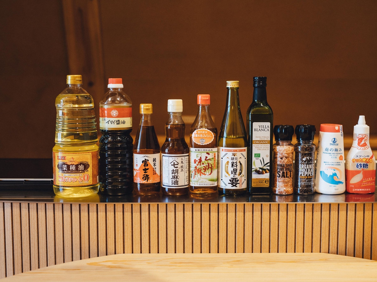 調味料:砂糖、酢、醤油、海塩、みりん、酒、胡麻油、オリーブオイル、サラダ油、胡椒、岩塩