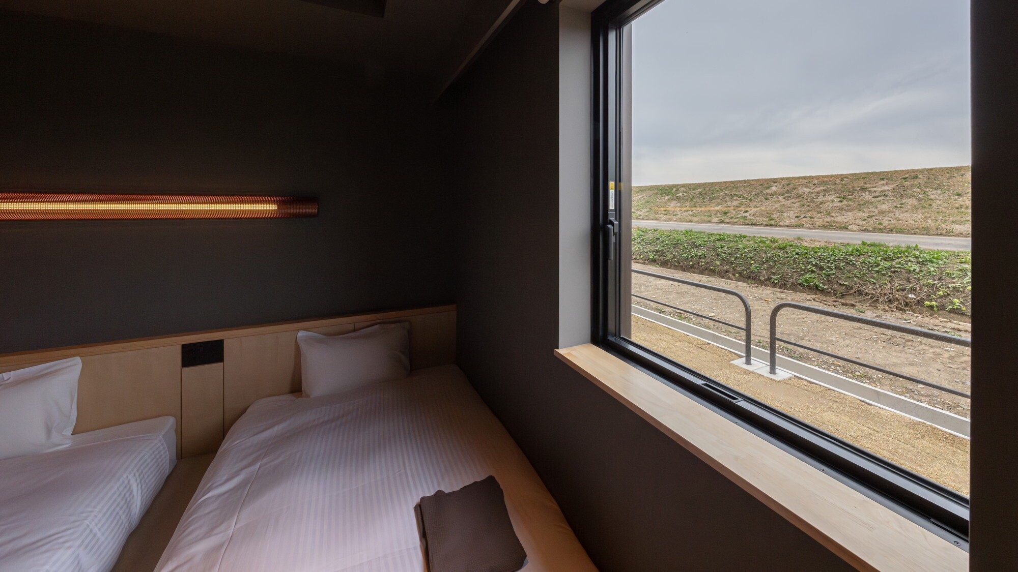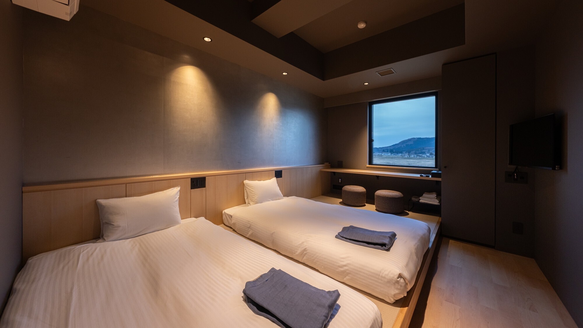 低層階のため、河川敷が望みにくい客室となっております。 お一人でもくつろげるシャワー・トイレ付のツインルームです。※バスタブなし ※空調は全館一括管理です