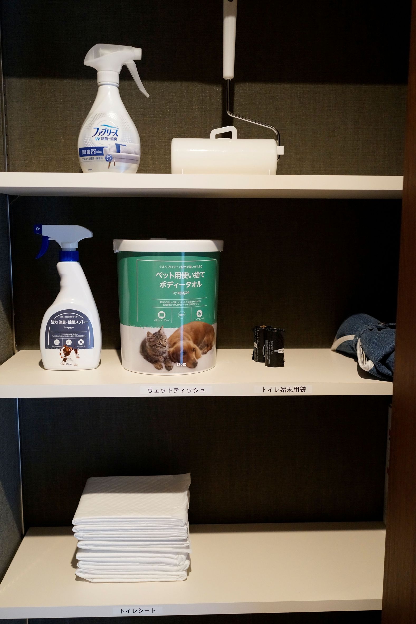足洗い場・ケージ(土間に1つ、寝室に2つ)/ウォーターボウル・フードボウル/トイレシート/トイレ始末用袋/粘着ローラー/愛犬用タオル/ウェットティッシュ/消臭剤/ペットシーツ/トイレトレー/ペット用ごみ箱/空気清浄機/ベッド・マット/おもちゃ