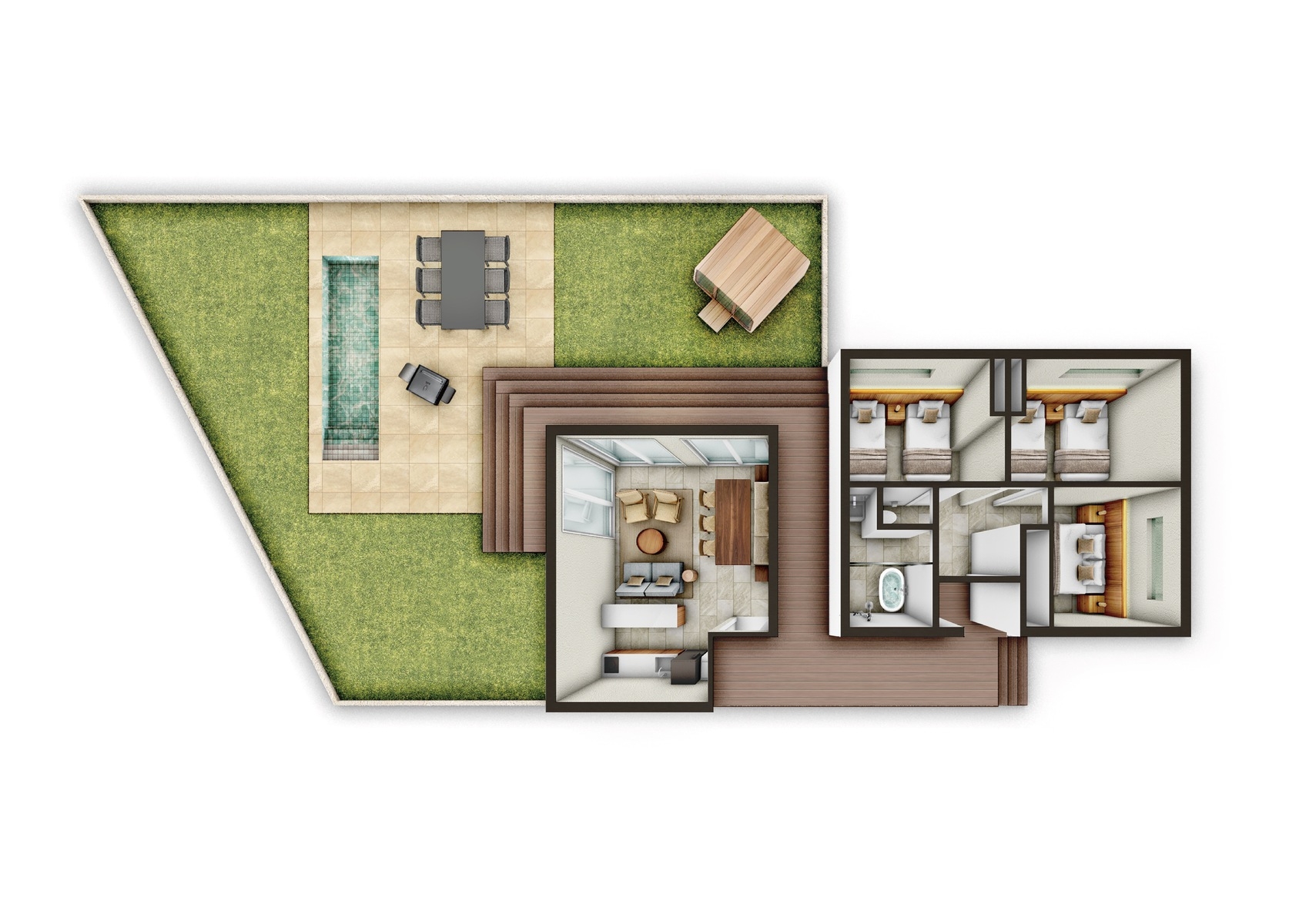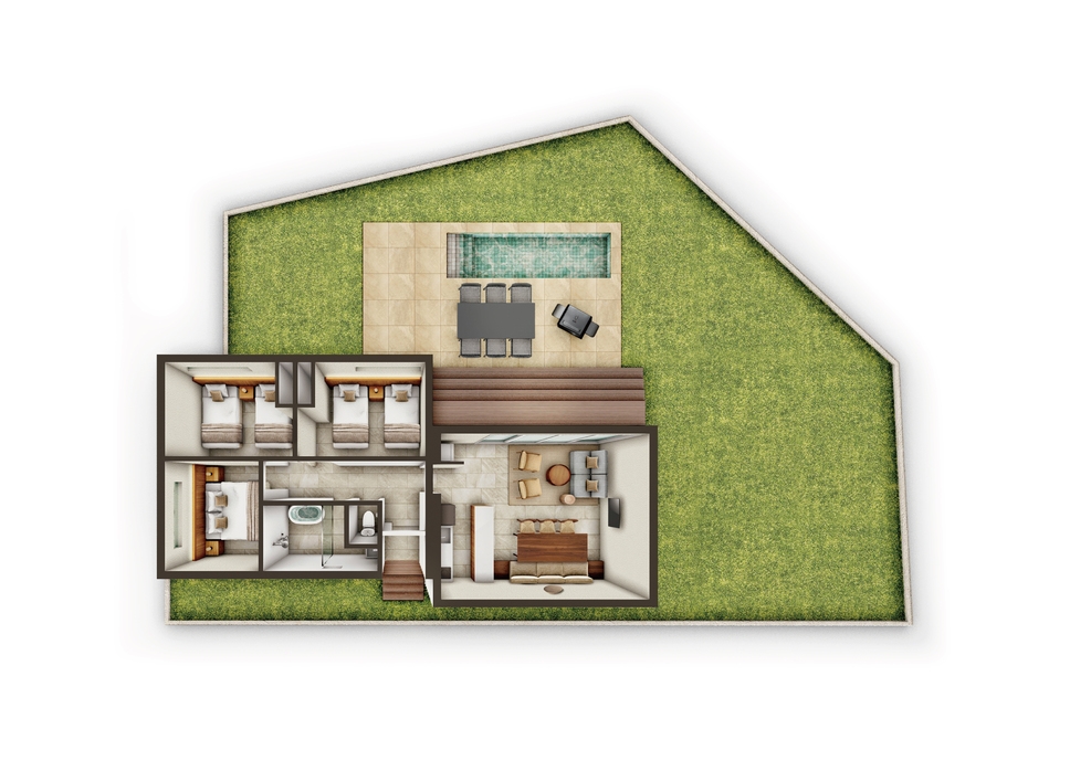 独立したリビング・ダイニングルームと3つのベッドルーム。※プールは温水ではございません。