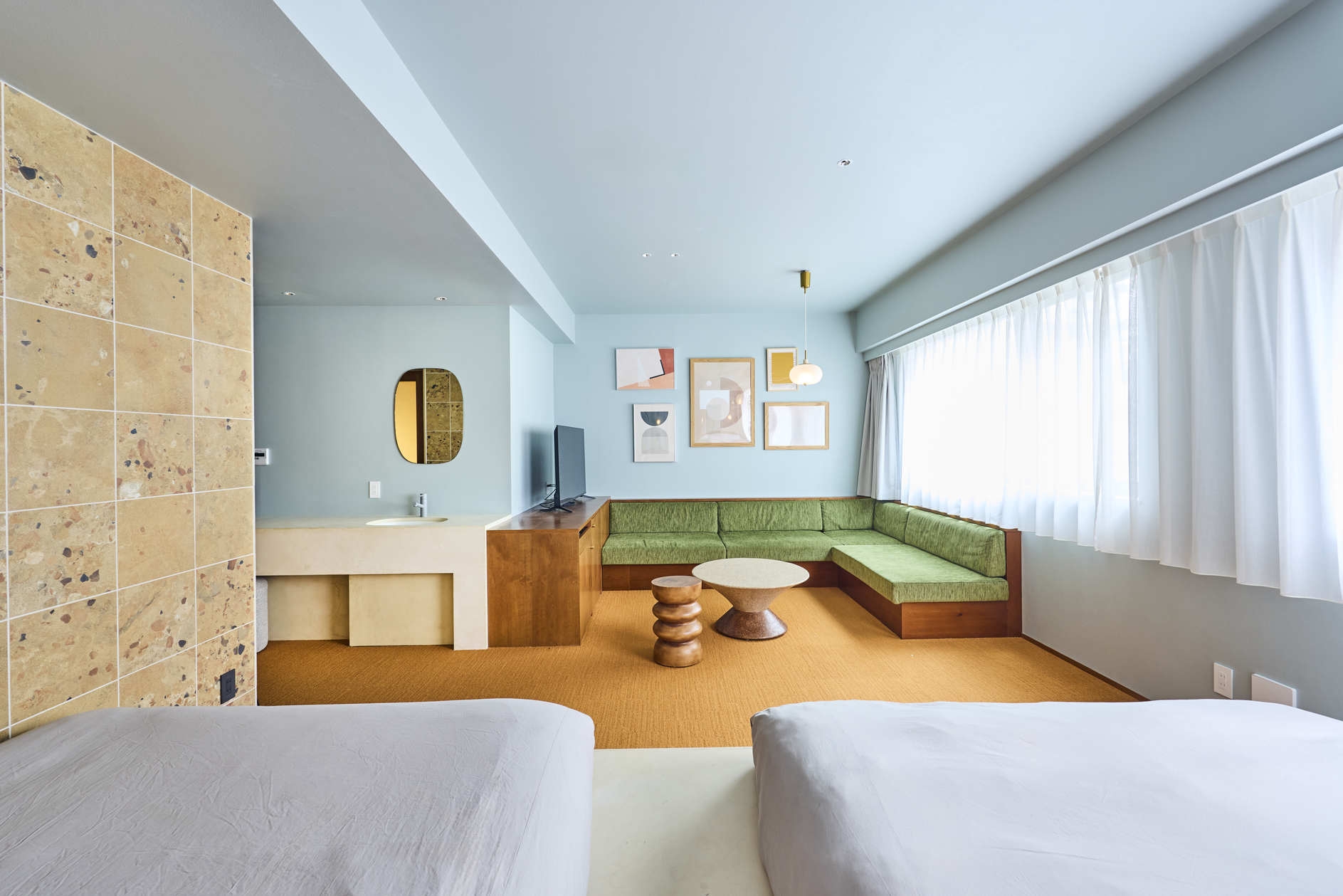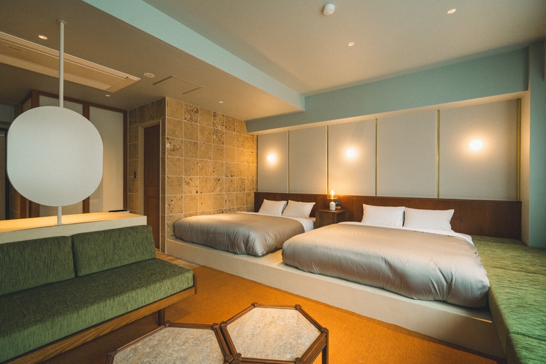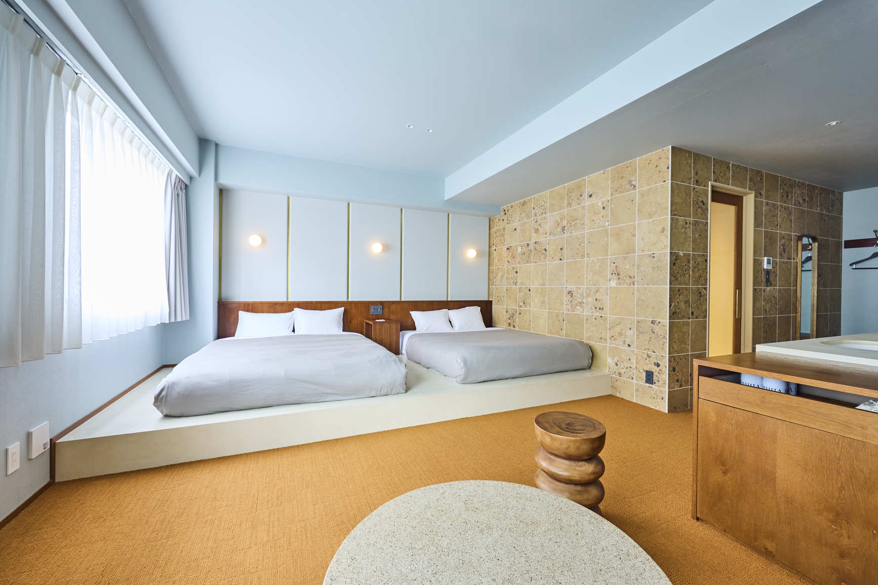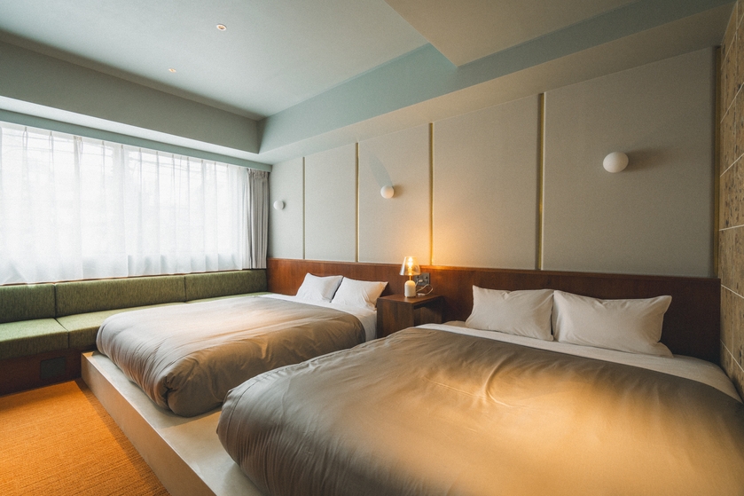 約43平米の広々空間にクイーンベッド2台を置いたお部屋です。友達と寛ぐ観光拠点やカップルの連泊、ワーケーションにぴったりなお部屋です。